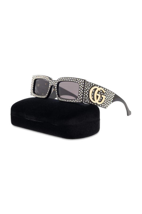 Black rectangular sunglasses from Gucci. Emblazoned with glossy crystals, studs and gold-tone logo hardware, this pair features grey lenses with 100% UV protection. Comes with a case, whose colour is individually selected for each pair of glasses.