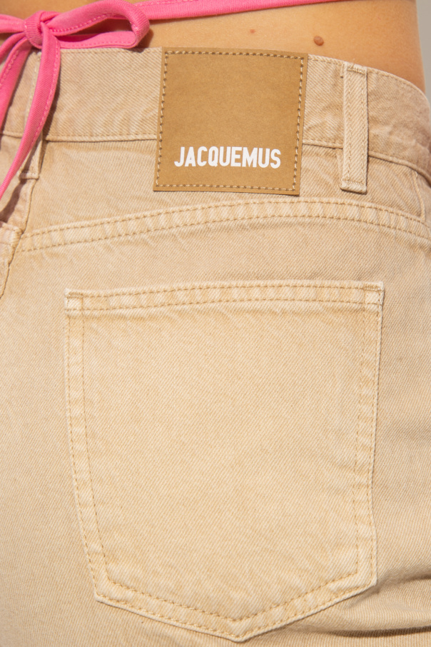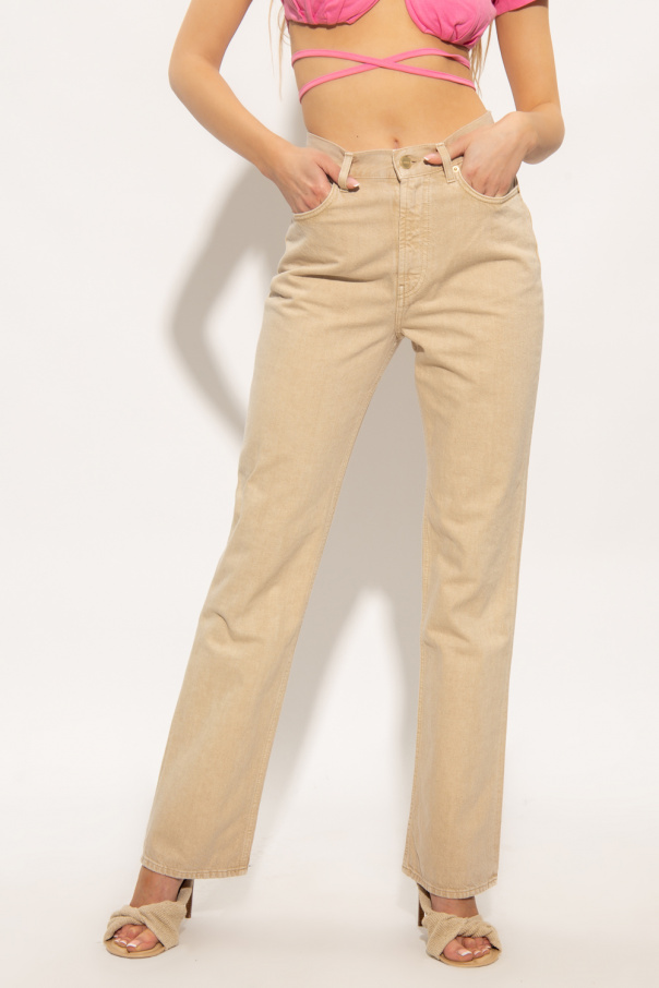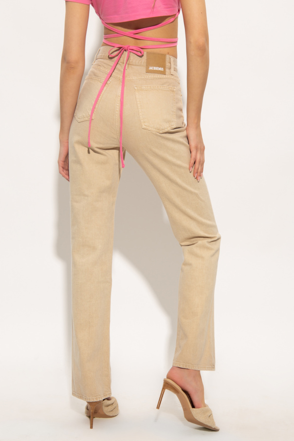 Beige high-waisted jeans from Jacquemus. Made of organic cotton, this pair features a zip and button closure, three front pockets, two back pockets, brown and white logo patch and flared legs.