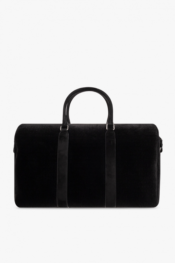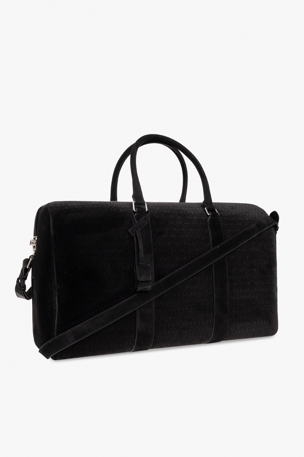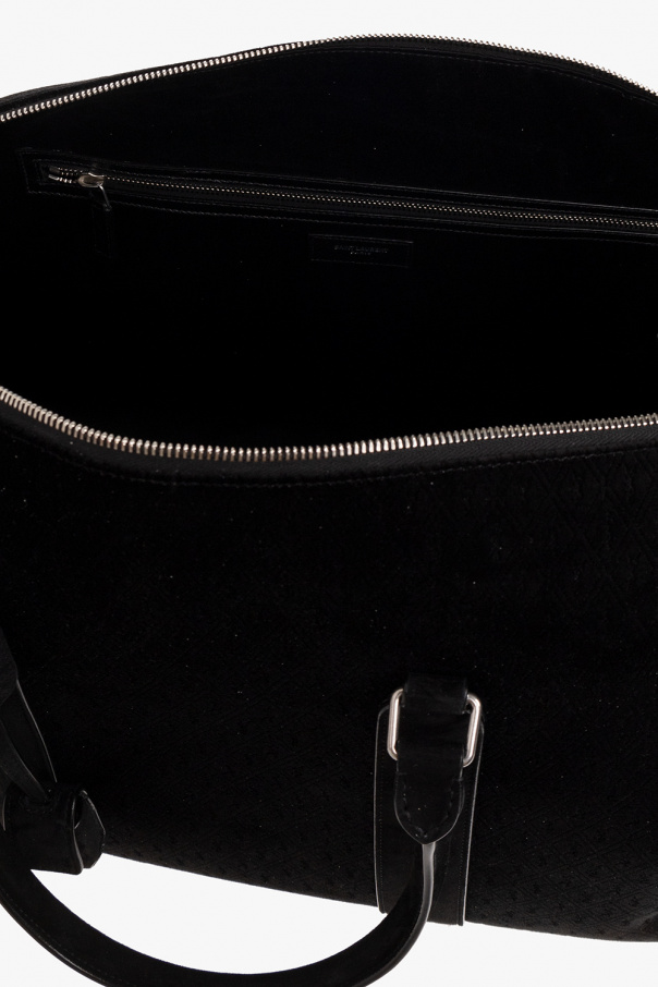 Black ‘Le Monogramme 48H’ holdall bag from Saint Laurent. Crafted from velvet embossed with a monogram pattern and lamb leather trims. Fastened with a two-way zip, this design features two half-round handles with a padlock on a strap, detachable and adjustable shoulder strap, silver-tone metal hardware and one internal compartment with one zip pocket.