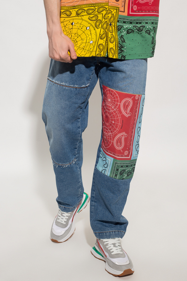 Blue distressed jeans from Marcelo Burlon. Fastened with buttons, this pair falls down with a slightly tapered legs and is complete with multicolored patches with a paisley motif, three front pockets and two back pockets.
