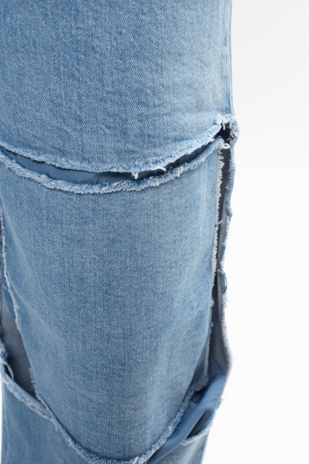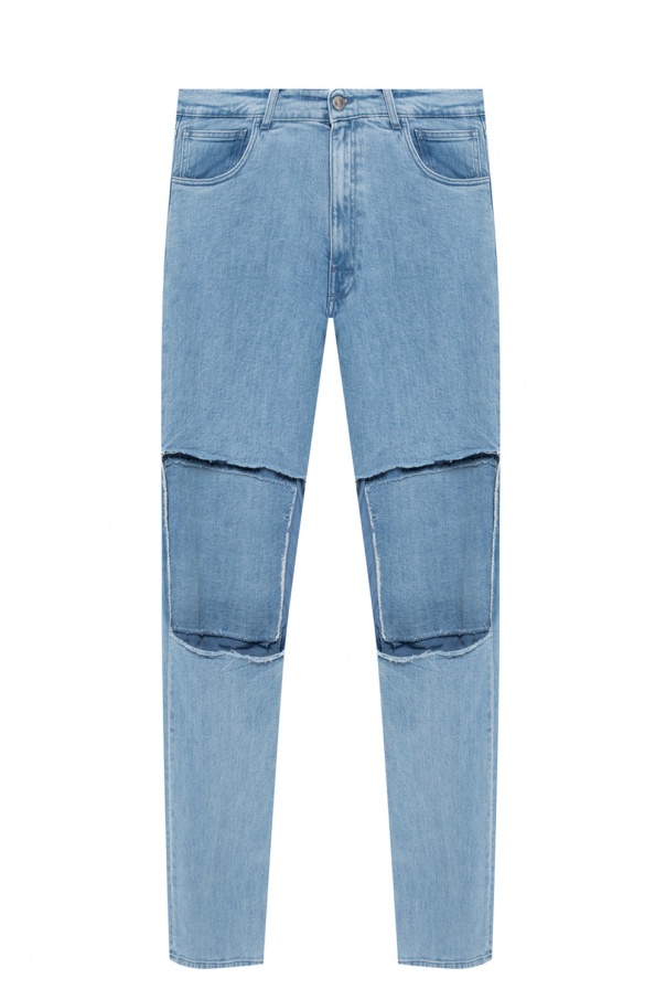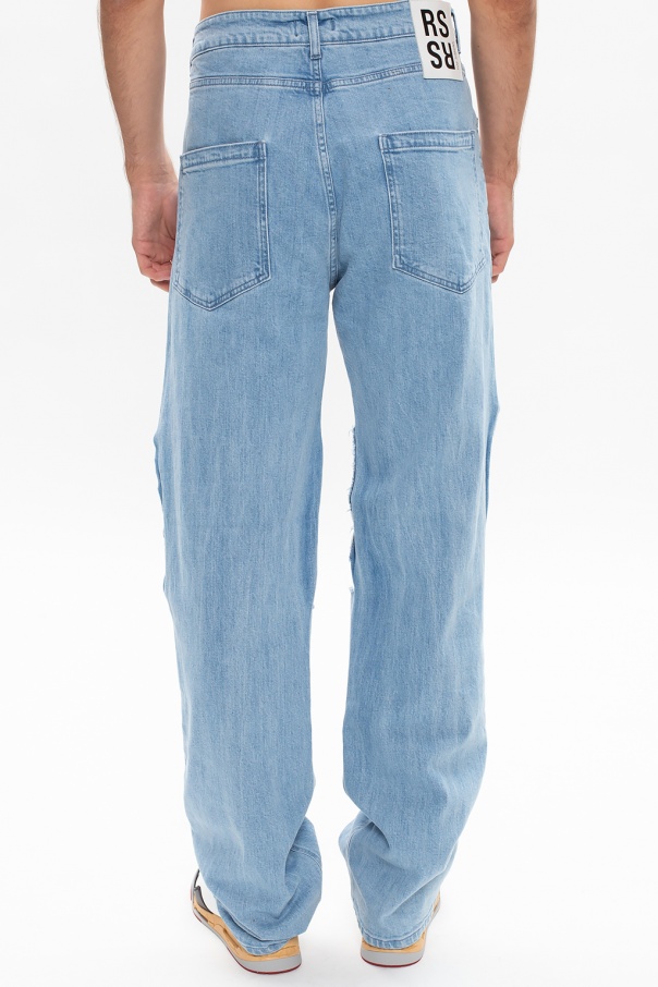 Blue jeans with a raw edge from Raf Simons. Fastened with a zip and button, this straight leg design is complete with a white and black logo patch, three front pockets and two back pockets.