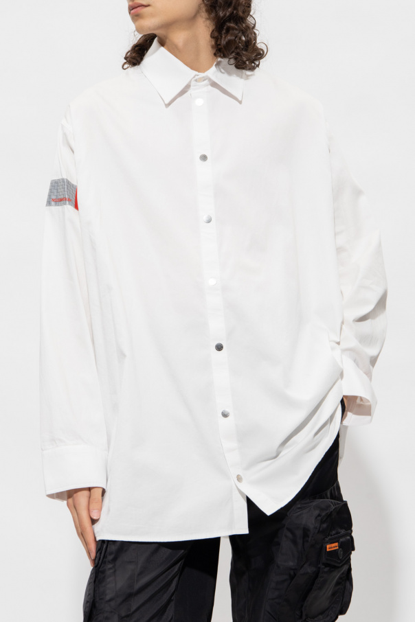 White loose-fitting shirt from Heron Preston. Fastened with logo-engraved snaps, this garment features a red and grey fabric insert with a logo and reflective effect as well as long sleeves with snap-fastened cuffs and an orange logo patch.