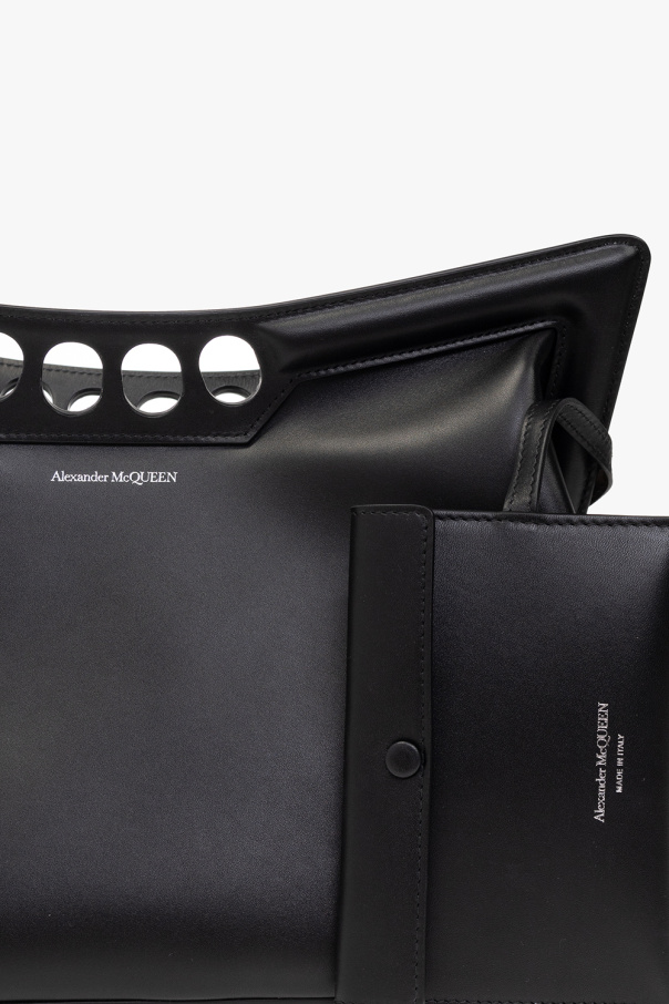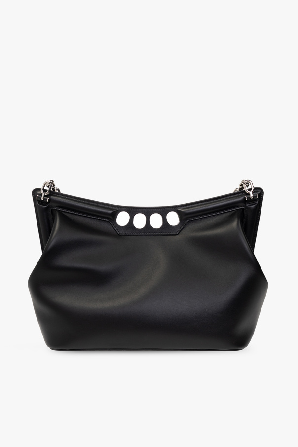 Black ‘The Peak’ shoulder bag from Alexander McQueen. Crafted from calf leather, this design secures with a snap and showcases a printed silver-tone logo on the front and a four-ring handle. It is complete with a chain shoulder strap, silver-tone metal hardware and one internal compartment with a strapped zip pouch featuring a flap.