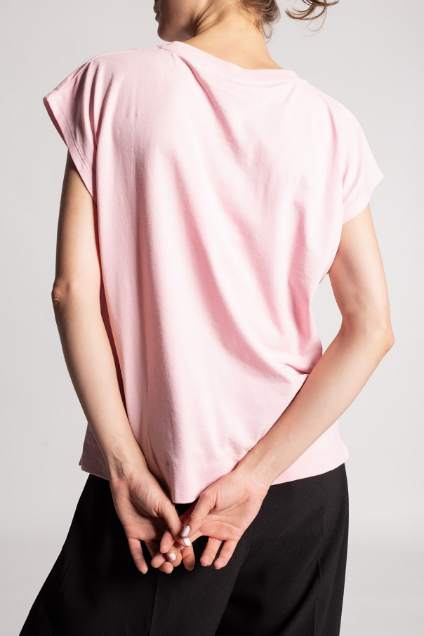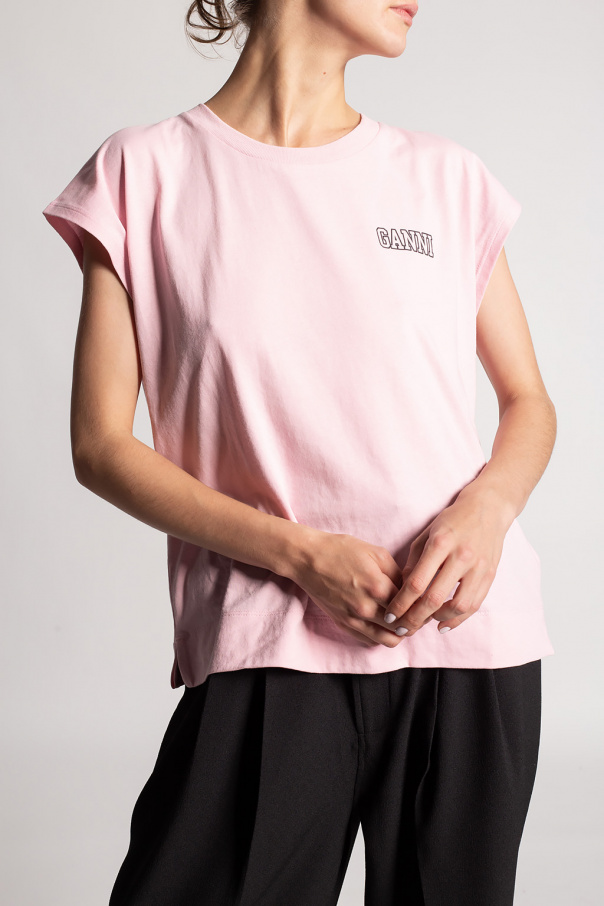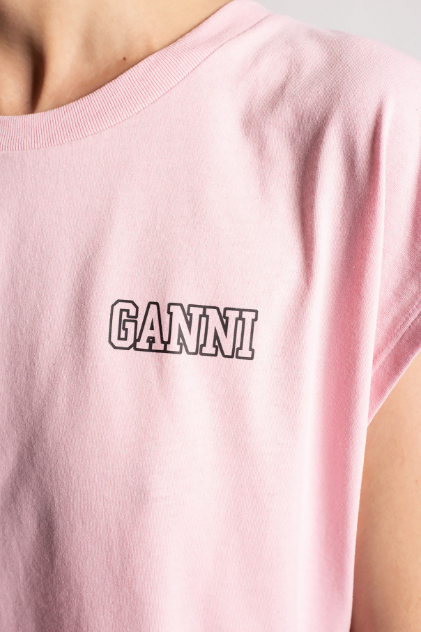 Light pink sleeveless top from Ganni. Decorated with a dark grey logo print, this garment is complete with a ribbed round neck.