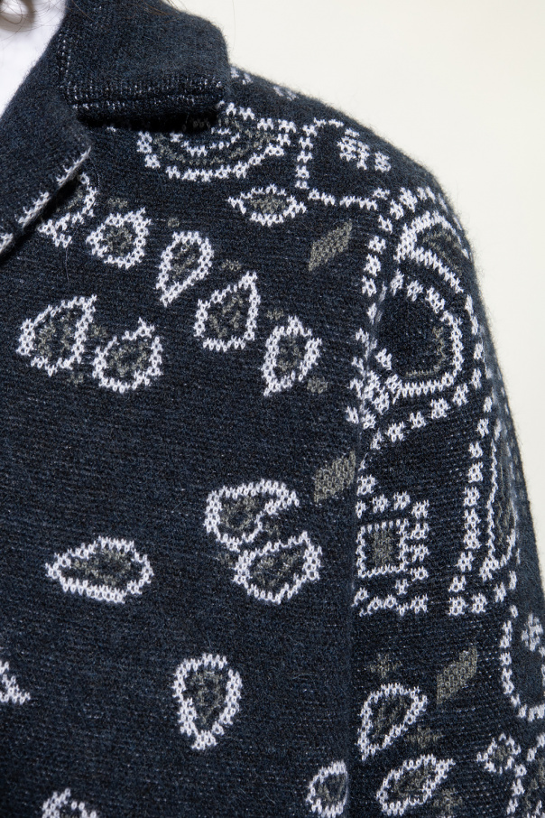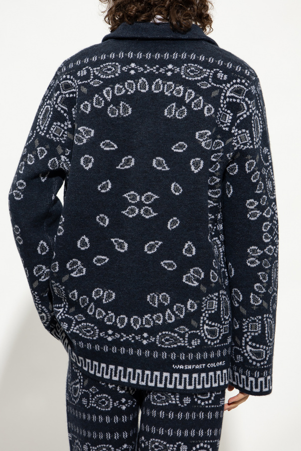 Navy blue ‘Bandana Piquet’ cardigan from Alanui. Crafted from a wool and alpaca wool blend, this style showcases an embroidered paisley pattern in grey and white, a collar, button fastenings and long sleeves.