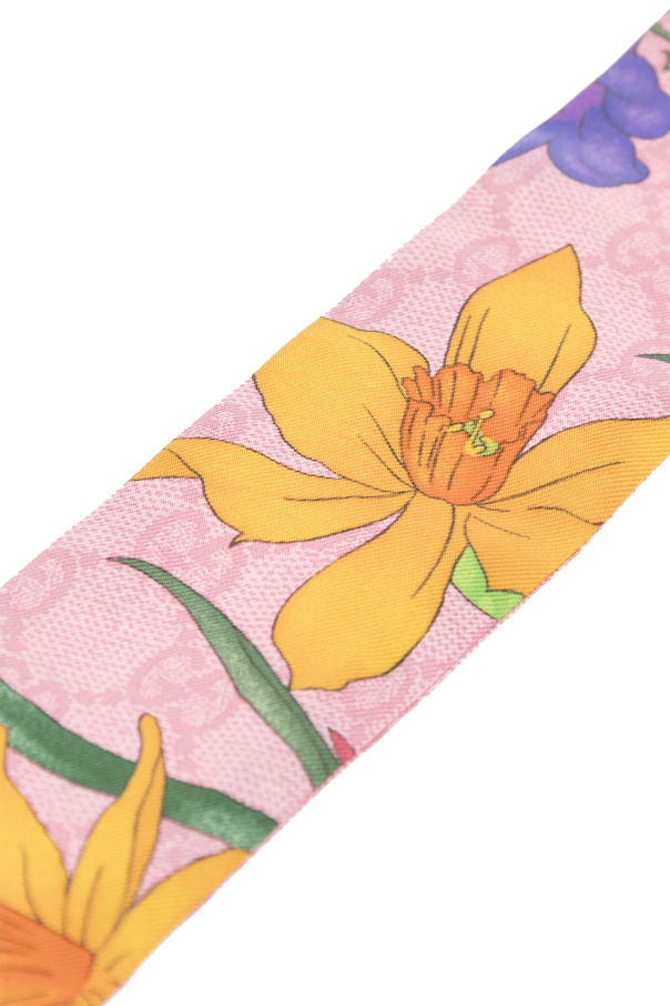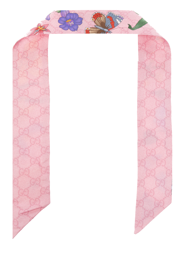Pink neckerchief from Gucci. Made from silk, this item showcases the GG Supreme pattern. One side features a colourful pattern with flowers and insects, the other one flaunts a green and red Web motif.