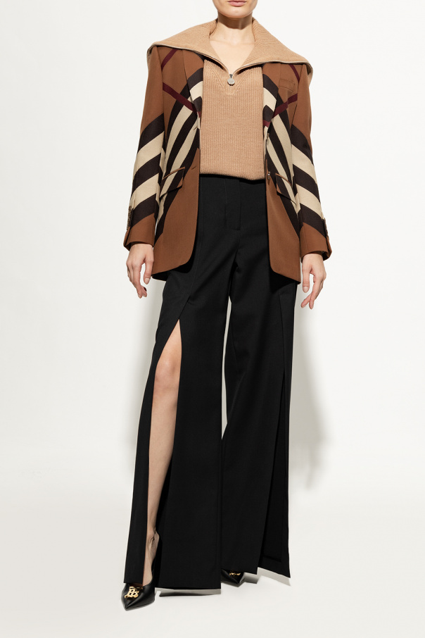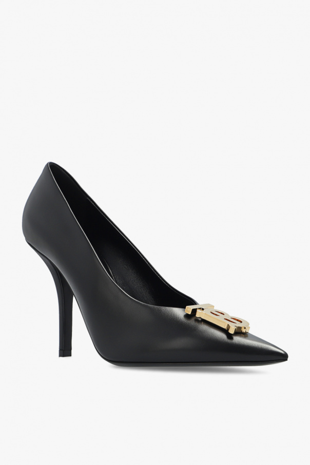 Black stiletto pumps from Burberry. Crafted from calf leather, this model sits on a black leather sole and features a pointed toe silhouette and gold-tone brass logo hardware on the front.