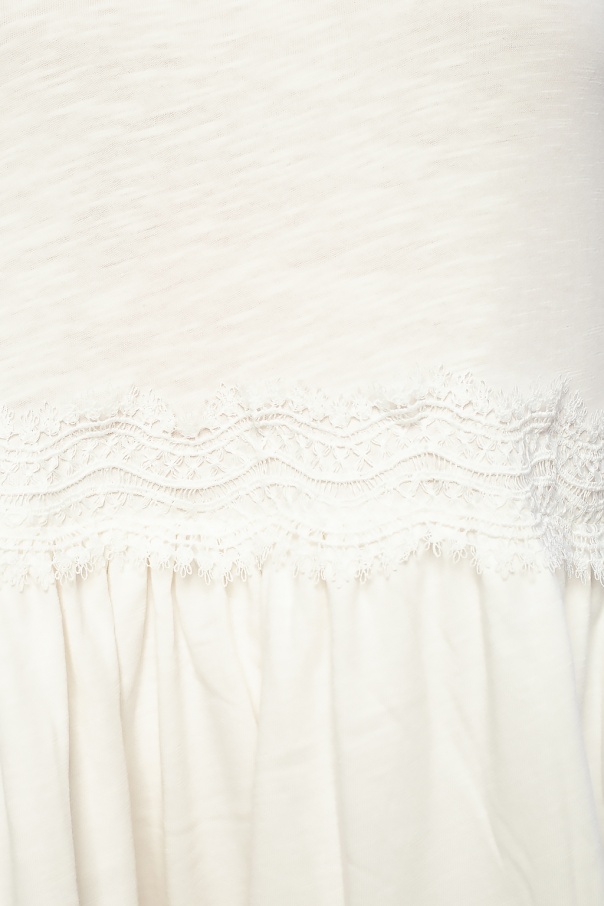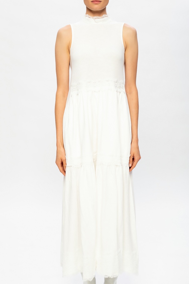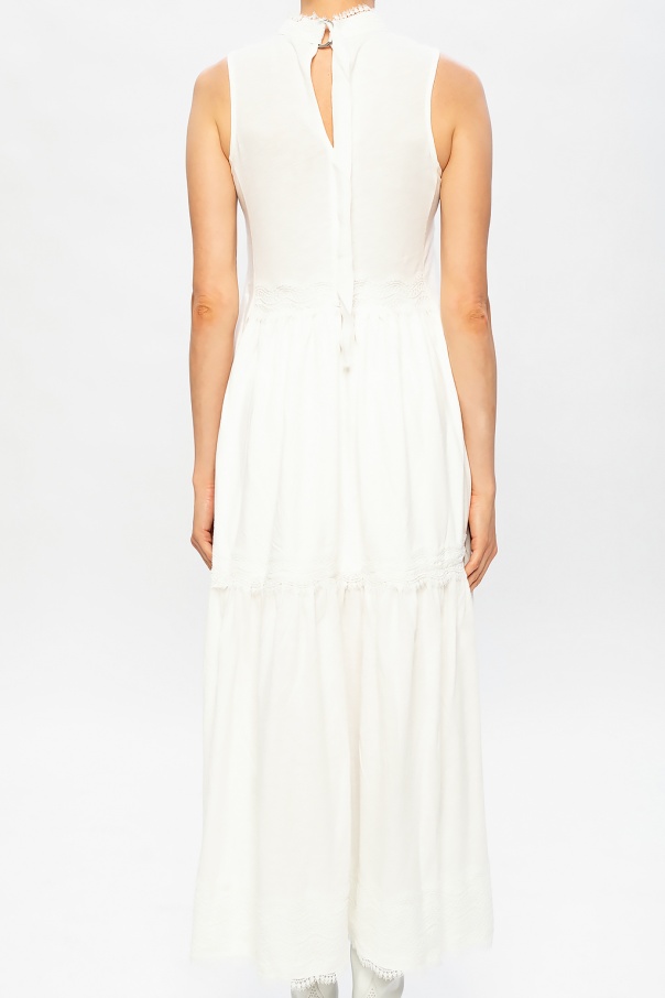White ‘Tier’ maxi dress from AllSaints. Tied at the back, this flared design is enriched with lace inserts.