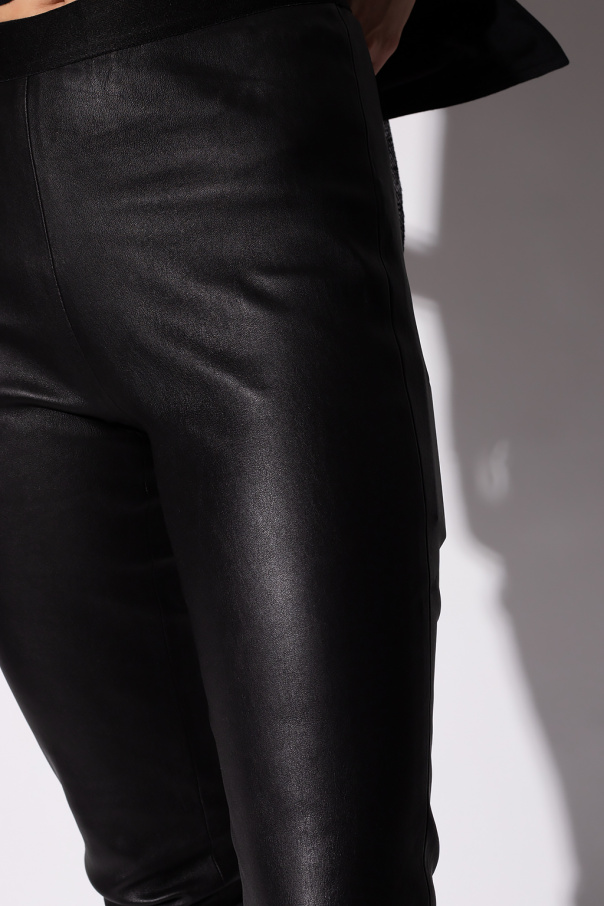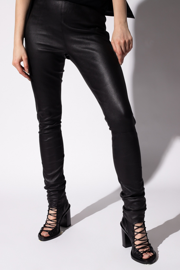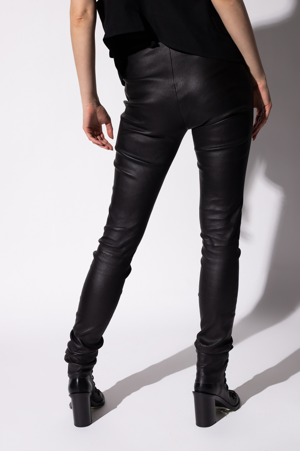 Black trousers from Ann Demeulemeester. Crafted from leather, this tapered leg design is complete with an elastic waistband and raw cut edges.