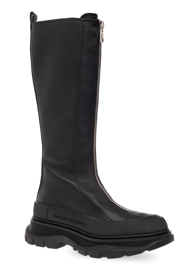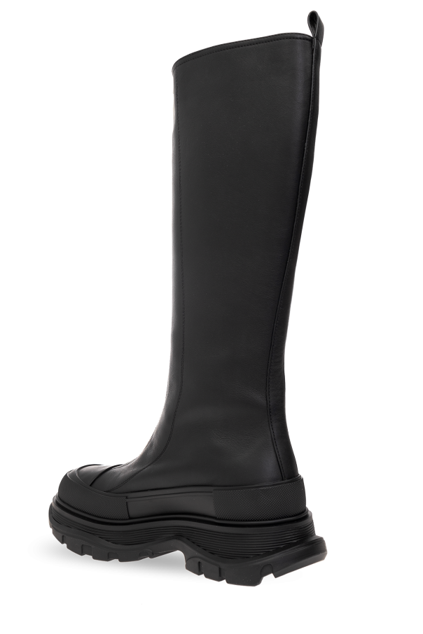 Black ‘Tread Slick’ knee-high boots from Alexander McQueen. Made from calf leather, this model sits on a black rubber sole and features a long silver-tone zipper and a rubber insert with an embossed logo on the side.