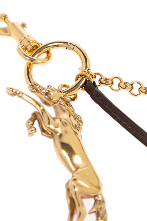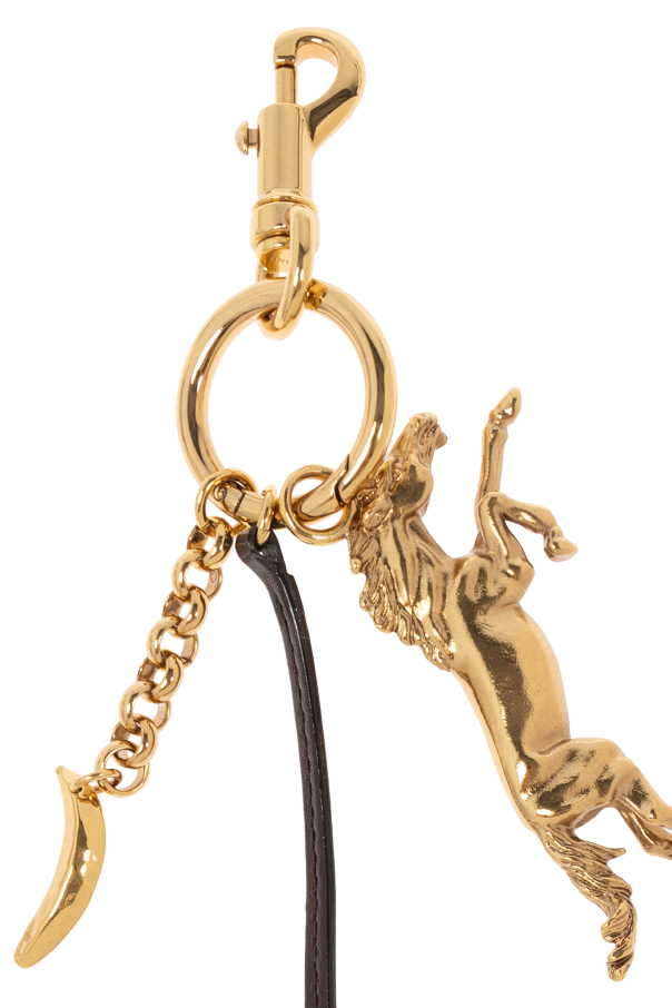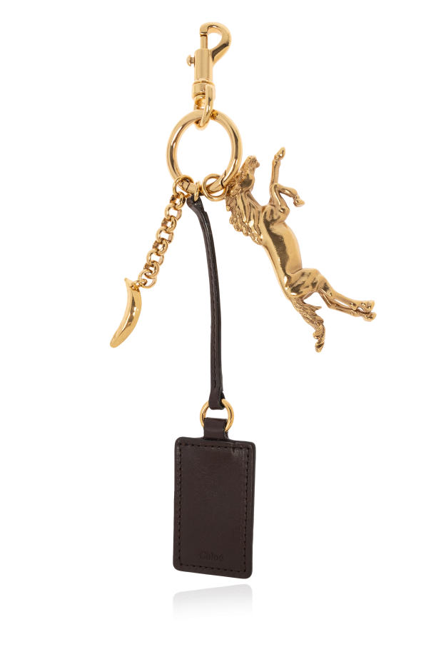 Introducing the Chloé Charm Keychain, an exquisite accessory that encapsulates the essence of luxury and sophistication. This opulent piece features a gold-toned jumping horse charm, meticulously sculpted with intricate details, evoking a sense of elegance and dynamism. The keychain is complemented by a delicate chain and a petite crescent-shaped charm, both in a resplendent golden hue. Adding a touch of contrast, a dark leather charm embossed with the brand\'s name enhances its stately appearance. Crafted from premium materials such as leather and brass, this keychain not only exudes luxury but also offers functionality with its gold carabiner, ensuring easy attachment to keys or bags. Why Choose This Product? Artfully designed by the renowned Parisian house Chloé, known for its timeless yet progressive fashion. Features intricate detailing, showcasing exceptional craftsmanship. Combines high-end materials for a luxurious and durable accessory.