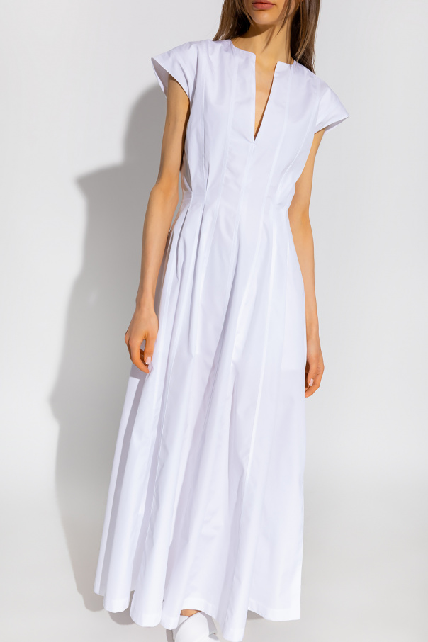 White fitted dress from BITE STUDIOS. Crafted from organic cotton, this design features a back zip, V-neck, short sleeves, two slip pockets and flared skirt.