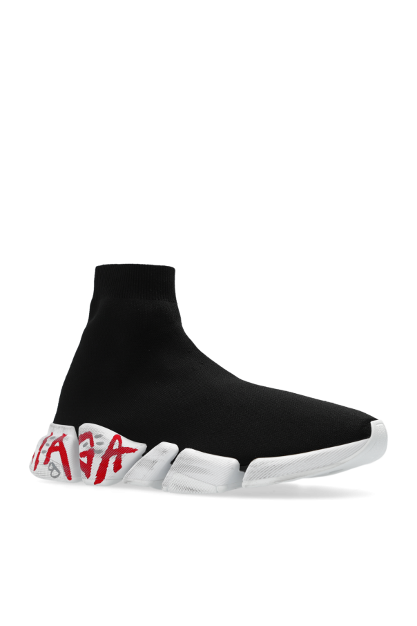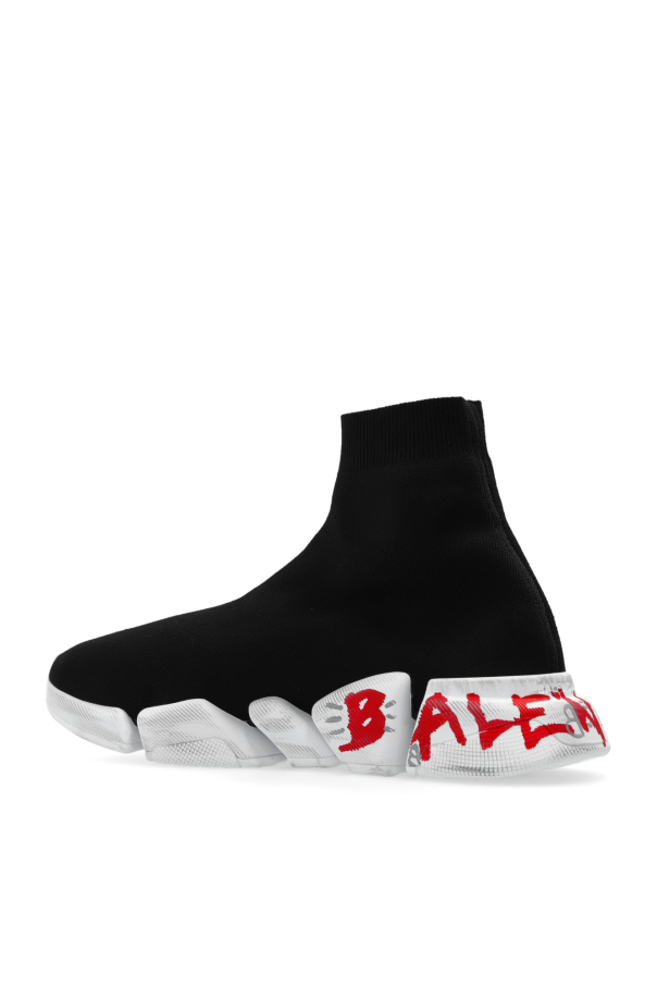 Black ‘Speed 2.0’ sock sneakers from Balenciaga. Crafted from fabric, this pair features a white rubber sole with a vintage effect and red logo print.