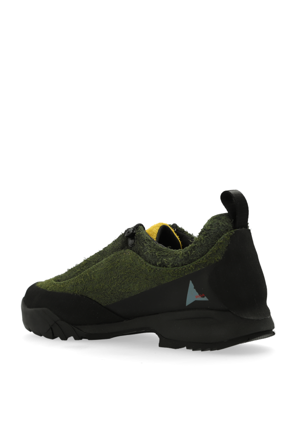 Introducing the exclusive Cingino trekking shoes by ROA, an exquisite blend of style and functionality. These women\'s sports sneakers epitomize elegance with their vibrant dark green hue, accented by sophisticated touches of black and yellow. Crafted with a low-cut silhouette to ensure freedom of movement, the Cingino shoes boast a robust, thick sole with a pronounced tread, offering impeccable grip and stability on diverse terrains. The exterior, reminiscent of luxurious suede or felt, exudes a unique and opulent allure. Featuring black laces with dynamic yellow inserts, a distinctive triangular logo on the side, and a vibrant yellow inner lining visible through the ankle opening, these sneakers are a statement of refined athletic fashion. A convenient heel loop further enhances the ease of wear. Designed for modern, active women, the Cingino trekking shoes are perfect for both outdoor adventures and urban escapades, seamlessly blending comfort, style, and practicality. Why Choose These Shoes? Elegant design with a luxurious look and feel Superior grip and stability thanks to a thick, treaded sole Perfect for both outdoor activities and everyday urban use Distinctive ROA branding and unique color accents Comfortable and easy to wear