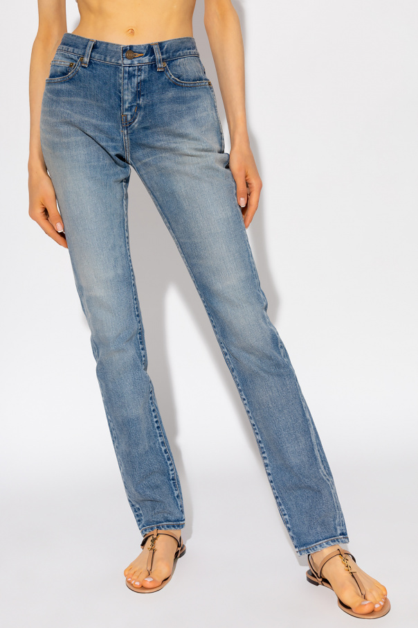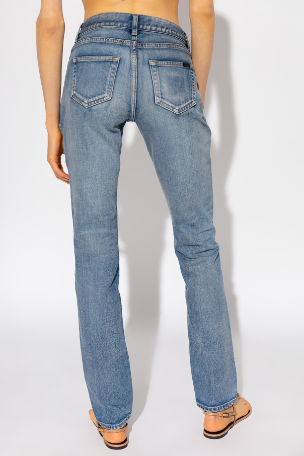 Blue jeans from Saint Laurent. Falling with tapered legs, this pair features a zip fly with a button, classic five pockets, a vintage treatment and a black logo patch at the back.