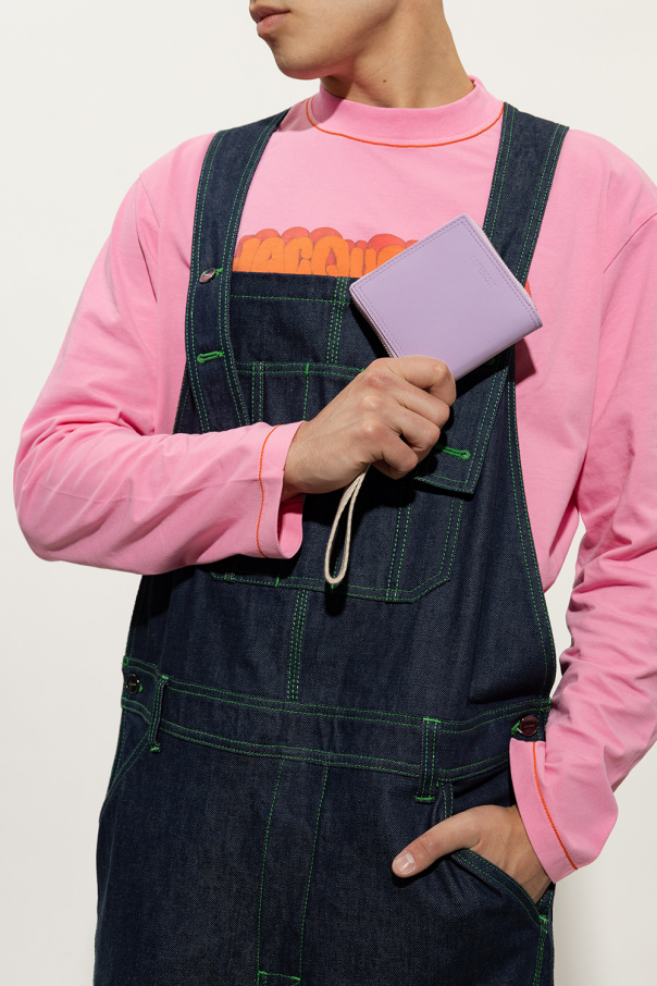 Light purple ‘Le Carre Rond’ wallet from Jacquemus. Crafted from leather, this design secures with a zipper with a cream canvas wrist strap and features an embossed logo on the front and a bill compartment, one slip pocket, a round zip coin pocket and four card slots inside.
