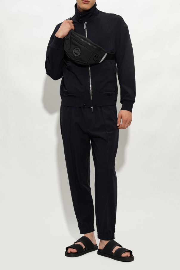 Black slides from Emporio Armani. Crafted from fabric and rubber, this model sits on a black rubber sole and showcases an embossed logo and a vintage effect.