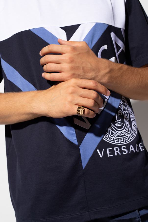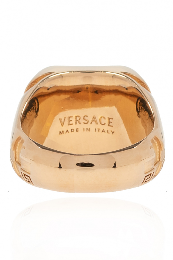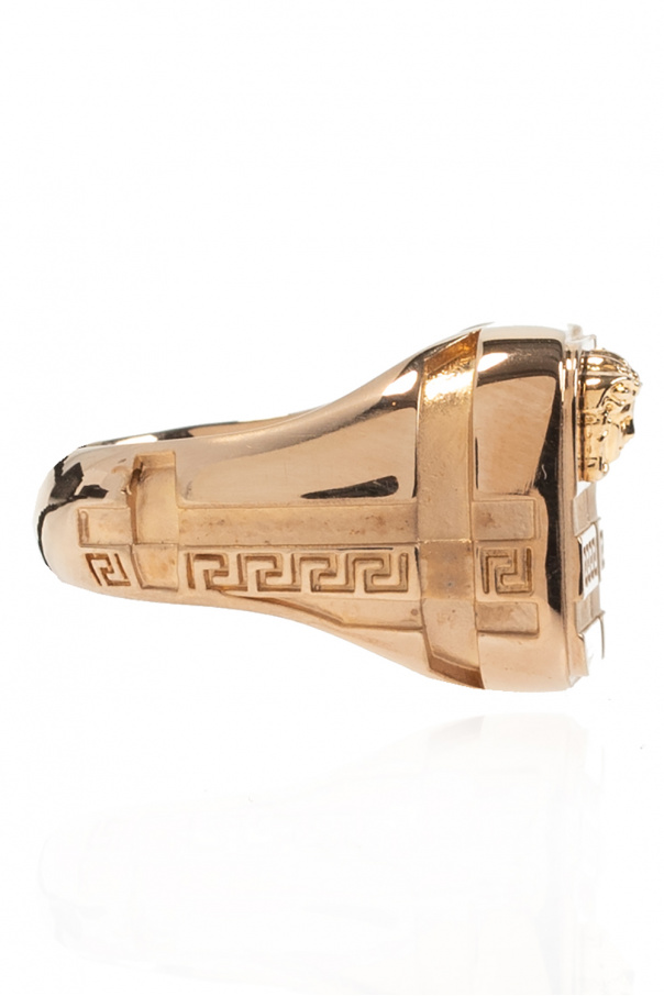 Gold-tone signet ring from Versace. Made of brass, this item showcases the brand's iconic Greek pattern and motif of Medusa.