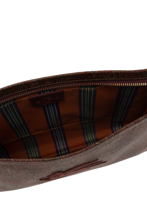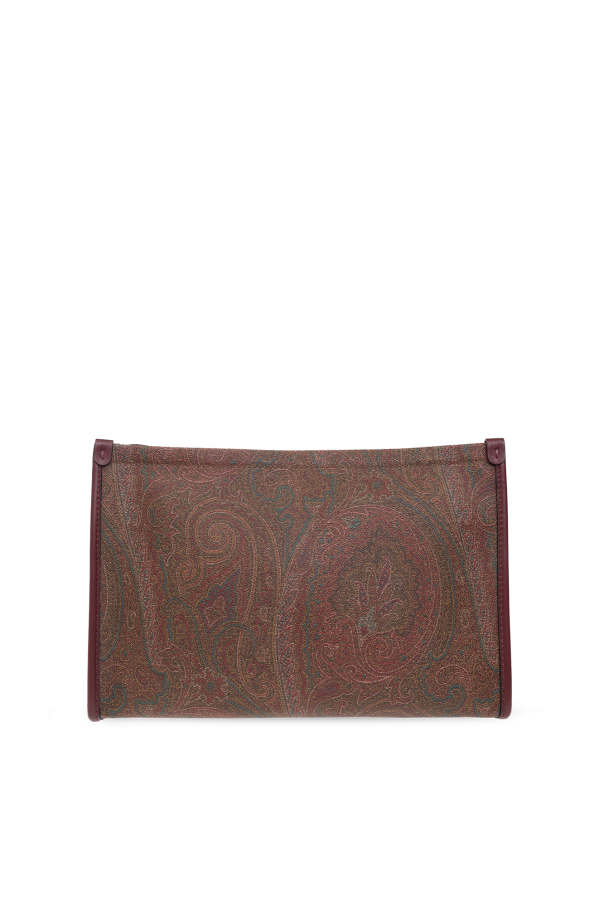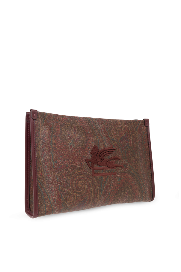 Maroon and brown handbag from Etro. Made of coated canvas decorated with a paisley motif and finished with leather, this model is complete with a zip fastening, Pegaso logo embroidered on the front, detachable wrist strap, one internal compartment with one slip pocket and gold-tone metal hardware.