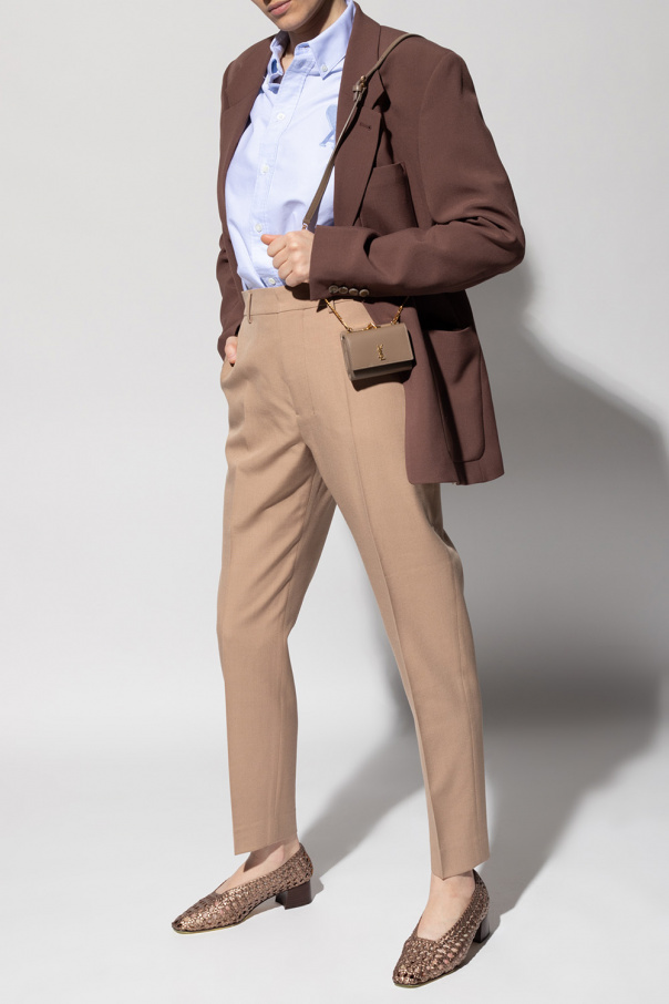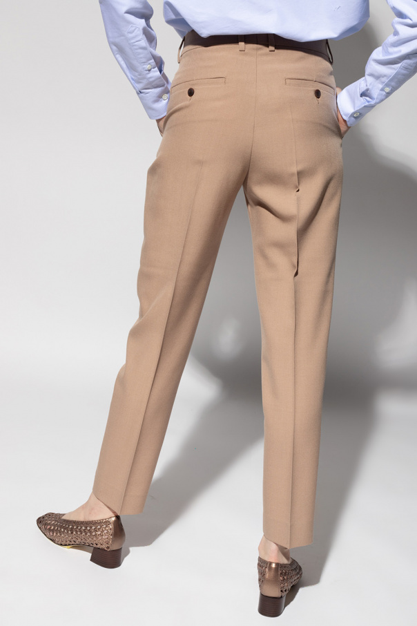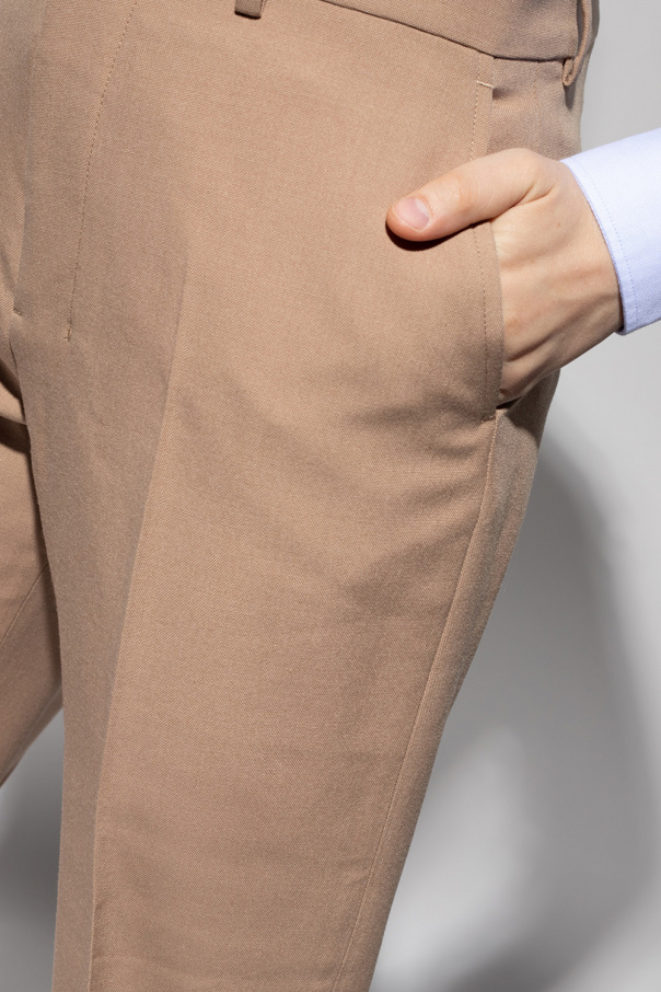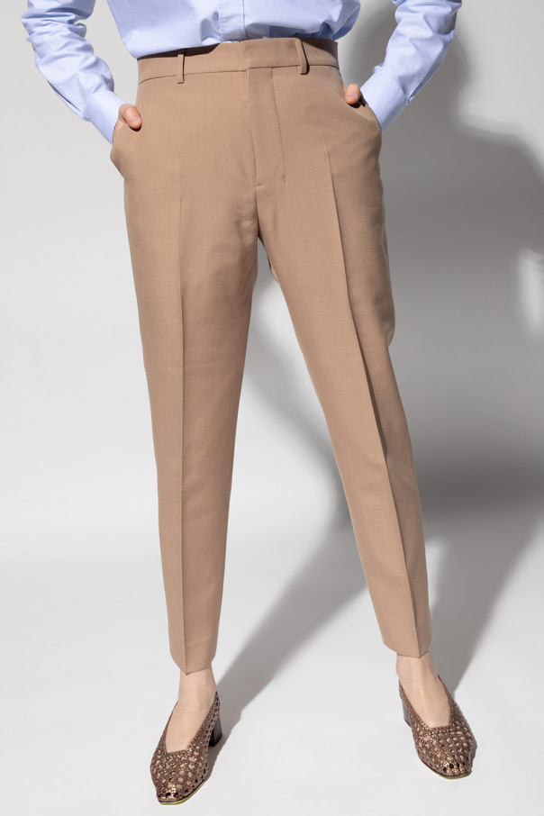 Beige pleat-front trousers from Ami Alexandre Mattiussi. Made of wool, this pair falls down with cropped tapered legs and features zip, hook and button fastening, two front pockets and two buttoned back pockets.