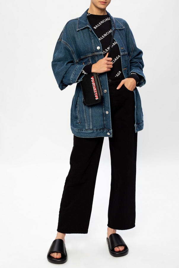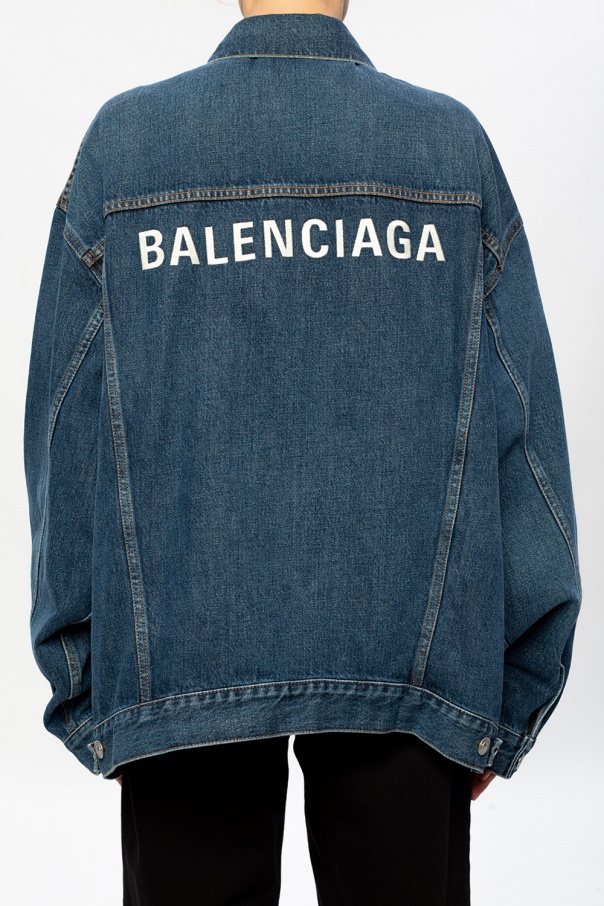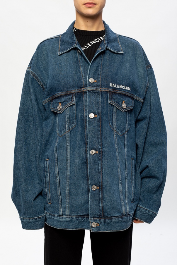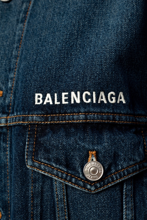 Blue denim jacket from Balenciaga. Fastened with buttons, this item features a white logo embroidery, two slip pockets and two buttoned flap pockets.