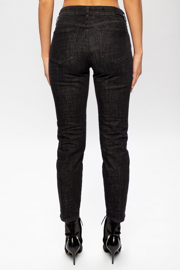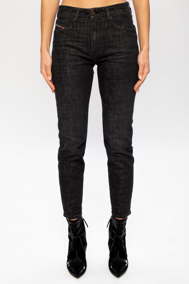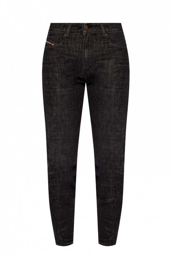 Grey ‘D-Joy’stonewashed jeans from Diesel. Fastened with a zip and button, this tapered leg design features five slip pockets and a black logo patch at the back.