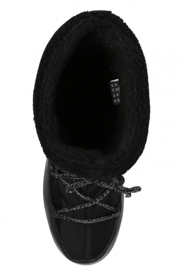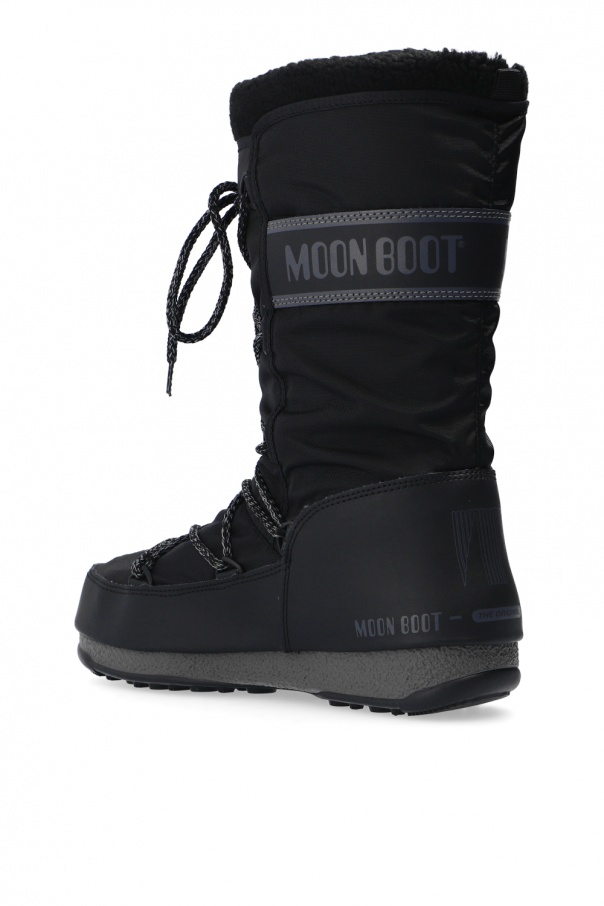 Black ‘Monaco’ snow boots from Moon Boot. Printed with the label's logo, this lace-up pair is set on a black and grey rubber sole and features eco-leather panelling and faux-fur lining.