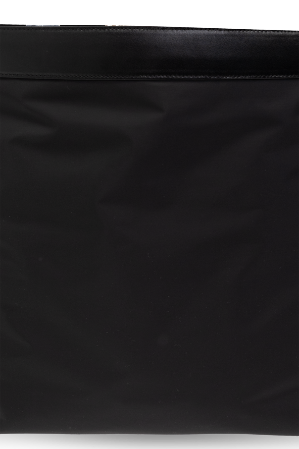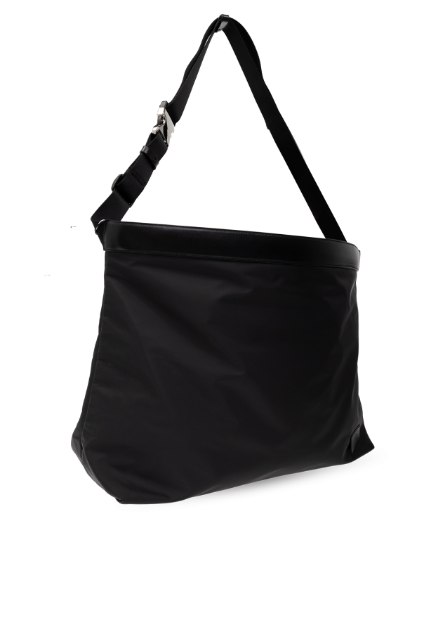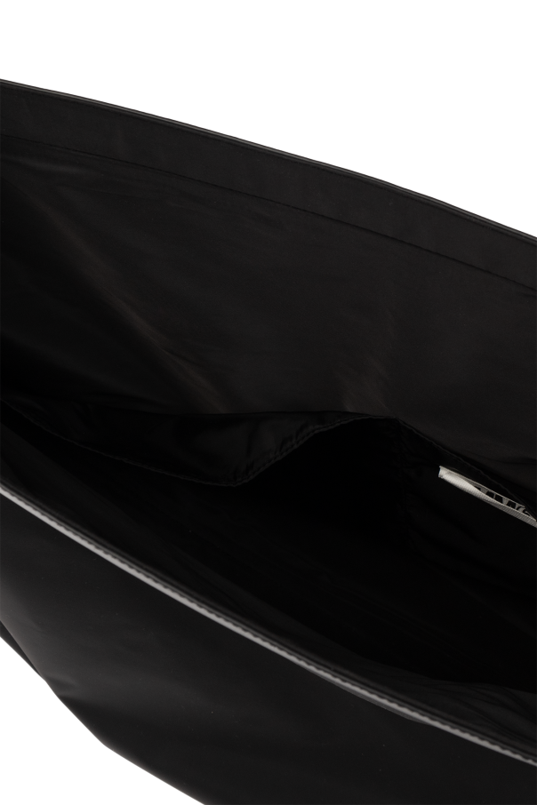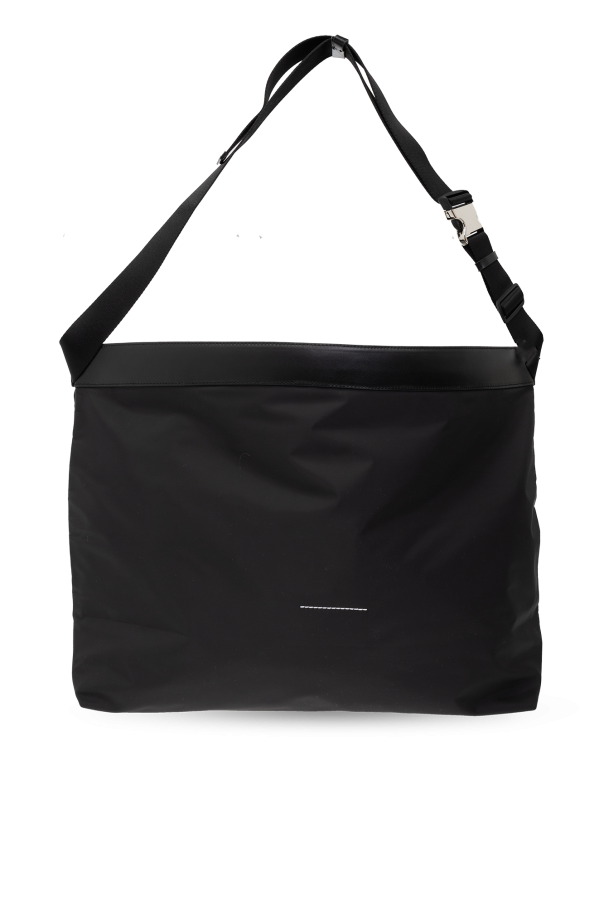 Black holdall bag from MM6 Maison Margiela. Decorated with a logo-embossed patch, this model features a shoulder strap, leather trims and one internal compartment with two slip pockets.