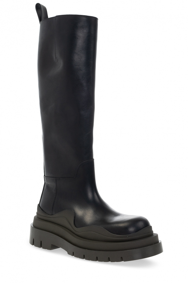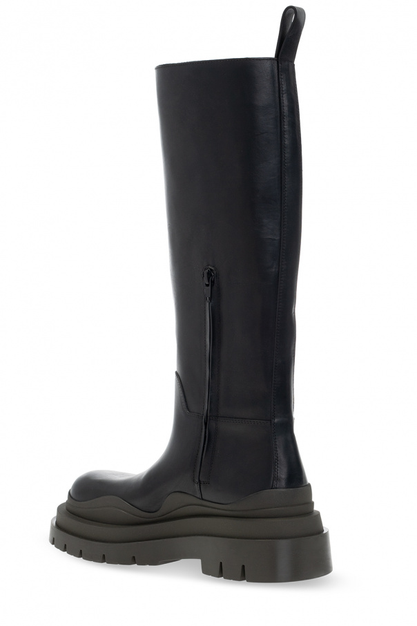 Black ‘Tire’ knee-high boots from Bottega Veneta. Crafted from calf leather, this model sits on a dark grey rubber platform and features a side zip fastening.