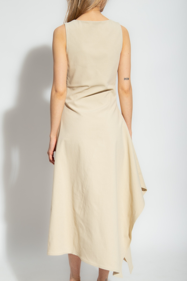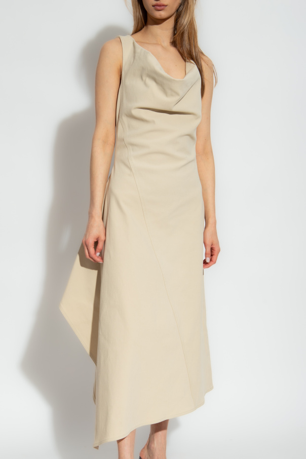 Light beige sleeveless dress from Bottega Veneta. Fastened with a hidden side zip, this asymmetric design has a draped neckline.