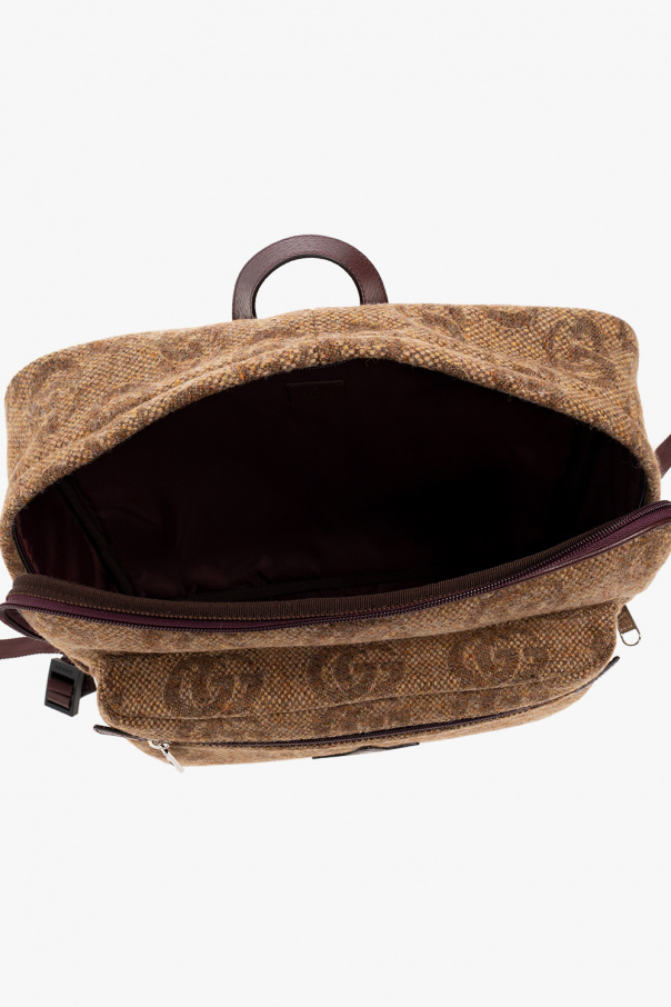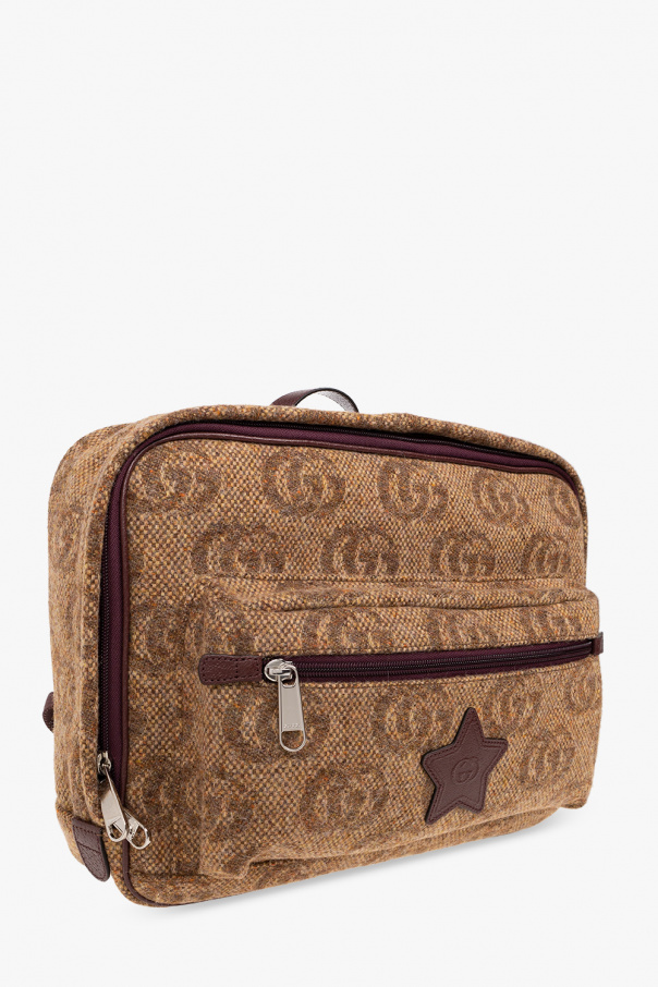 Brown backpack from Gucci Kids. Crafted from fabric decorated with the brand's ‘GG’ pattern, this design features a two-way zipper, a zip pocket accompanied by a logo patch, a top handle, adjustable shoulder straps and one internal compartment.