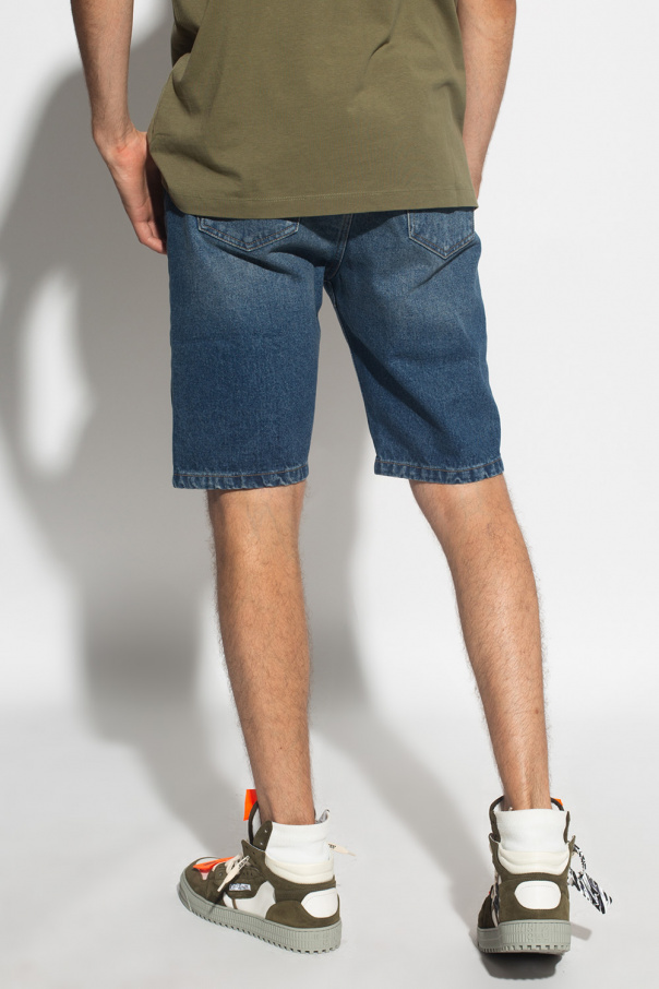 Blue denim shorts from Off-White. Equipped with a branded buckle belt, this pair features a zip fly with a button and classic five jean pockets.