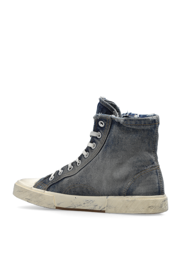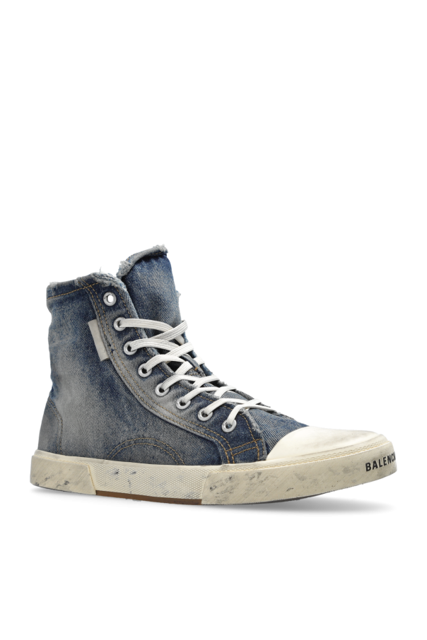 Blue and beige ‘Paris’ sneakers from Balenciaga. Crafted from fabric, this lace-up pair features a worn effect and a white rubber sole.