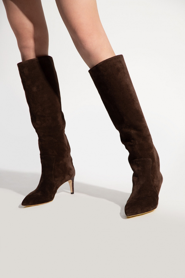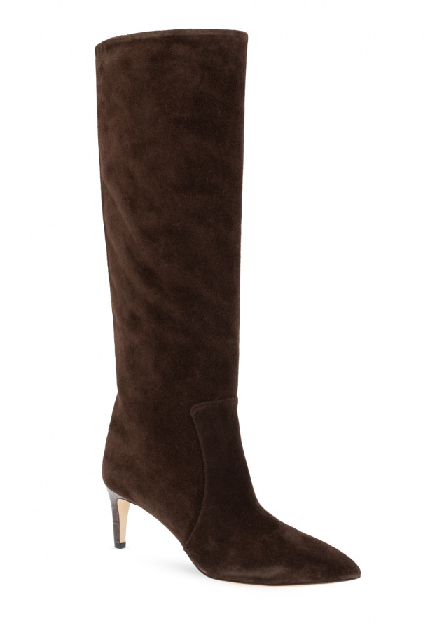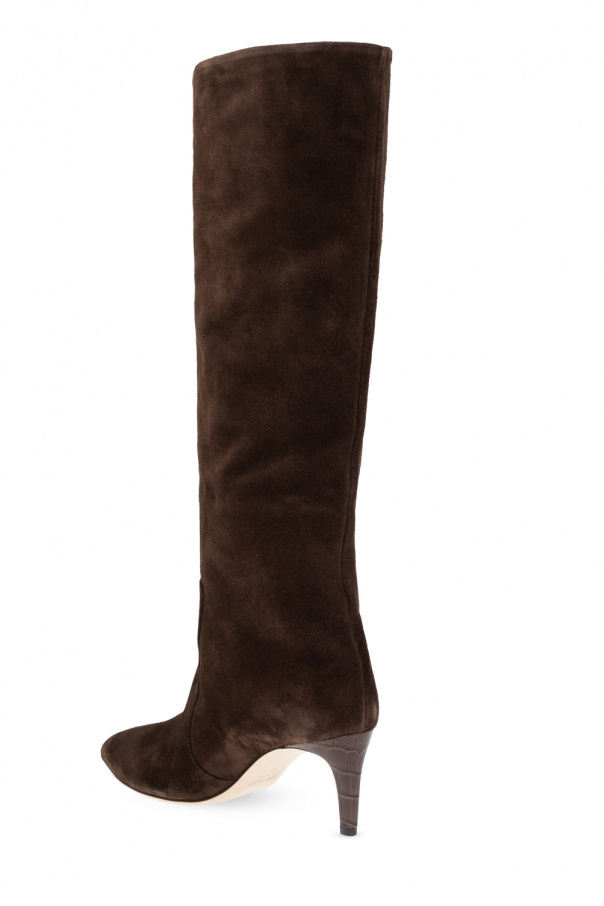 Dark brown 'Stiletto' knee-high boots from Paris Texas. Crafted from calf suede, this pair boasts a pointed toe silhouette and a beige leather sole.