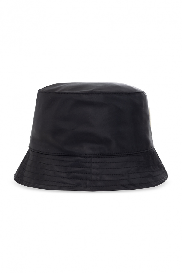 Black bucket hat from Moncler. This item showcases a cream, navy blue and red logo patch for brand recognition.