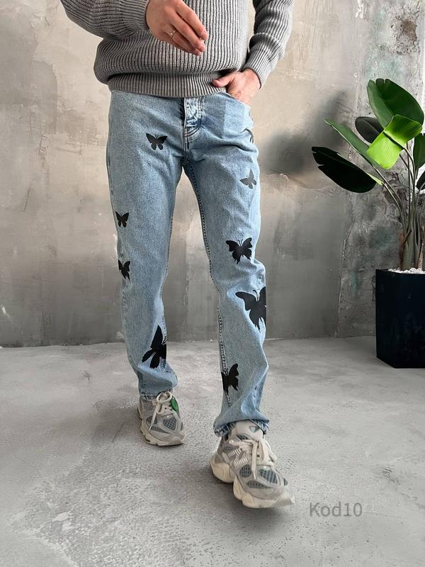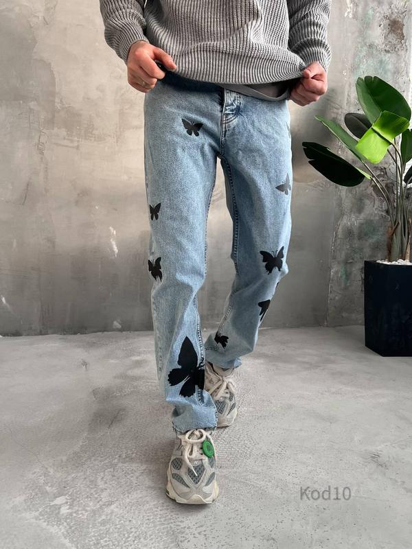 Голубые оверсайз джинсы мужские с принтами бабочки