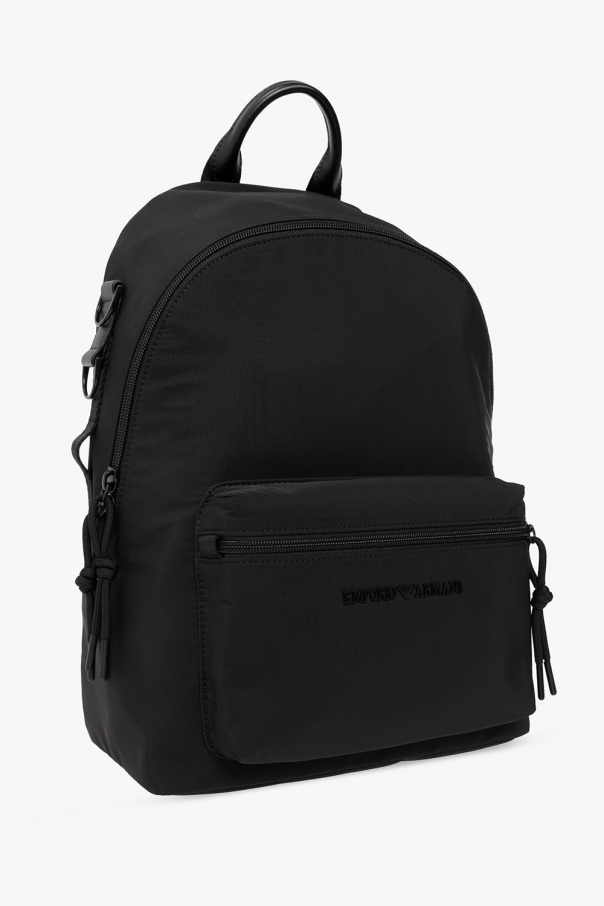 Black backpack from Emporio Armani, ‘Sustainability Project’ line. Fastened with a two-way zip, this model features a zip pocket, metal logo appliqué, half-round handle, adjustable shoulder straps, detachable and adjustable shoulder strap and one internal compartment with three slip pockets.