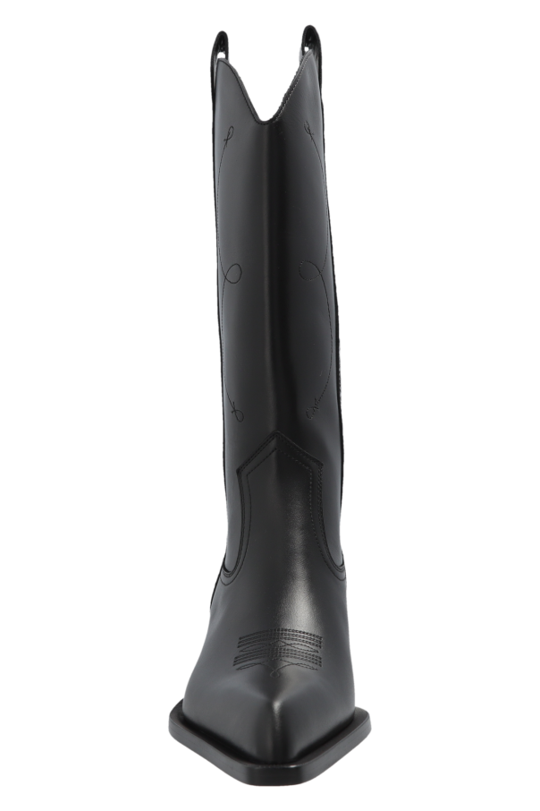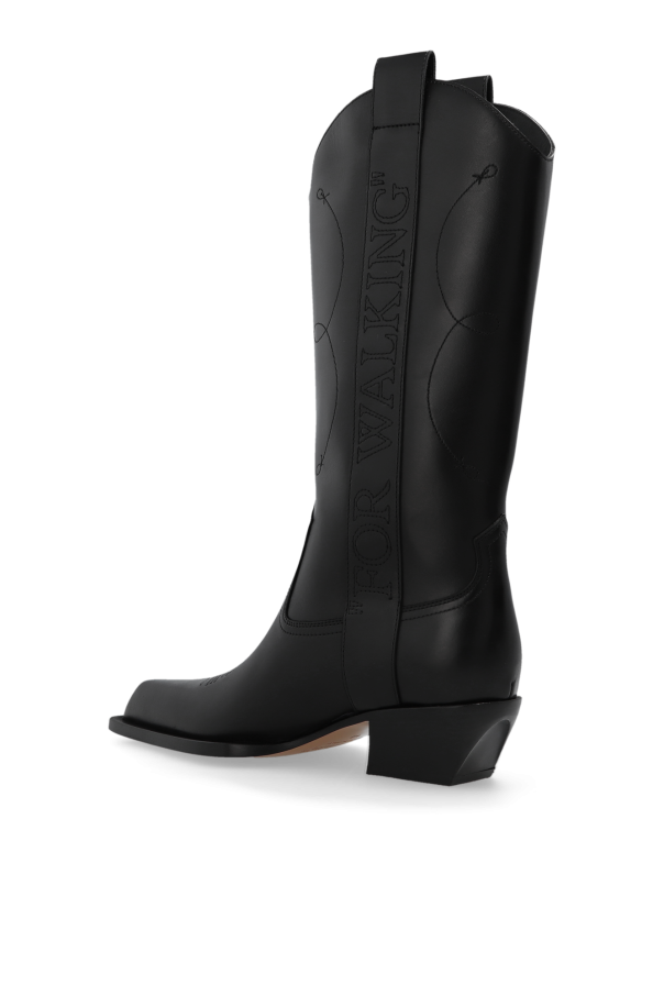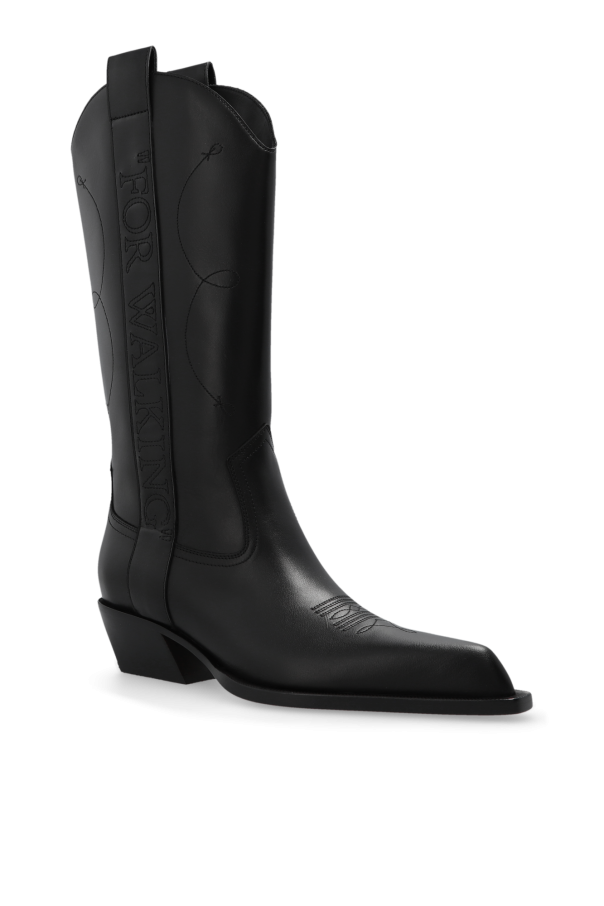 Black slip-on cowboy boots from Off-White. Made of leather. Decorated with an embroidered pattern and ‘FOR WALKING’ lettering, this pair features a pointed toe and a beige leather sole.