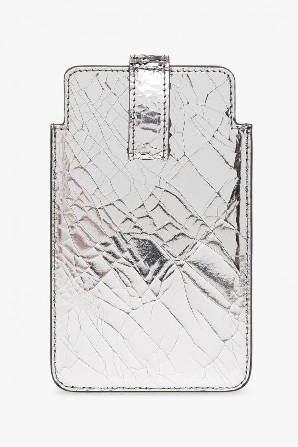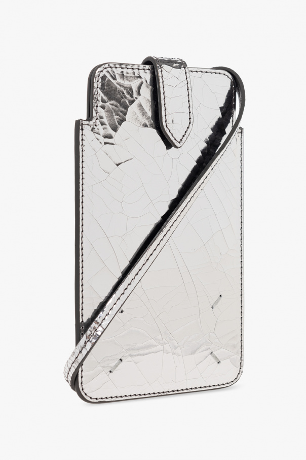 Silver-tone phone holder from Maison Margiela. Made from leather with distressed detailing, this item features a snap fastening, a shoulder strap, silver-tone metal hardware and one internal compartment.