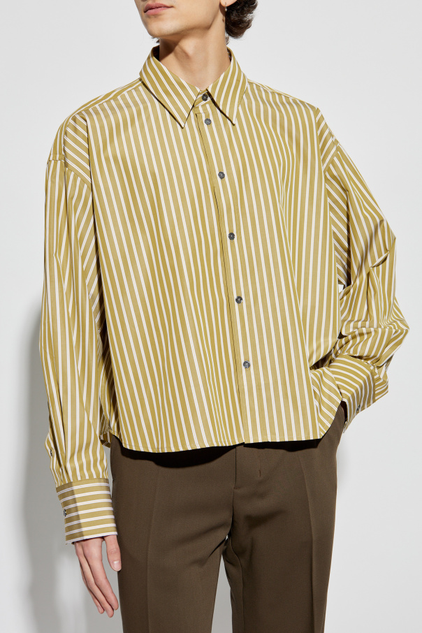 Presenting the Striped Pattern Shirt by the esteemed brand AMI Alexandre Mattiussi, an epitome of sartorial elegance. This exquisite shirt, adorned with vertical mustard and white stripes, exudes a modern and chic aesthetic. Crafted from premium-quality cotton, this shirt assures unparalleled comfort and a luxurious feel against the skin. Its relaxed fit, classic collar, and long sleeves with refined cuffs encapsulate timeless sophistication. Distinctive detailing includes a signature logo patch on the back, near the collar, adding an exclusive touch that signifies prestige. The shirt\'s design is complemented by a button-down front, enhancing its versatility for both casual and formal ensembles. Why Choose This Product? Exclusive design with elegant vertical stripes in mustard and white. High-quality cotton fabric for supreme comfort. Signature brand logo for a touch of exclusivity. Perfectly versatile for casual and formal styling.