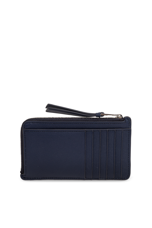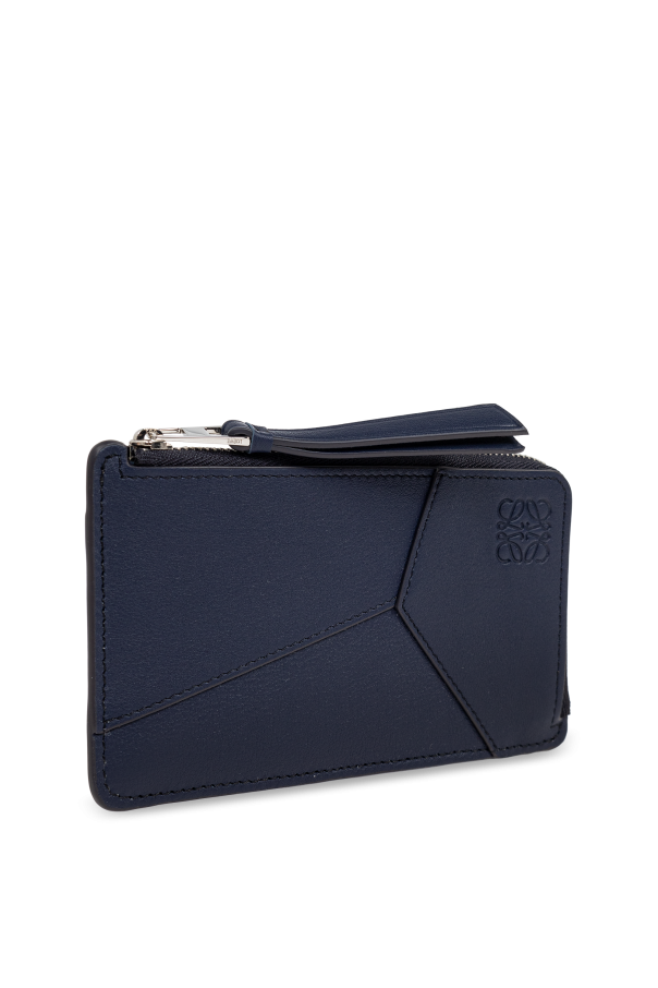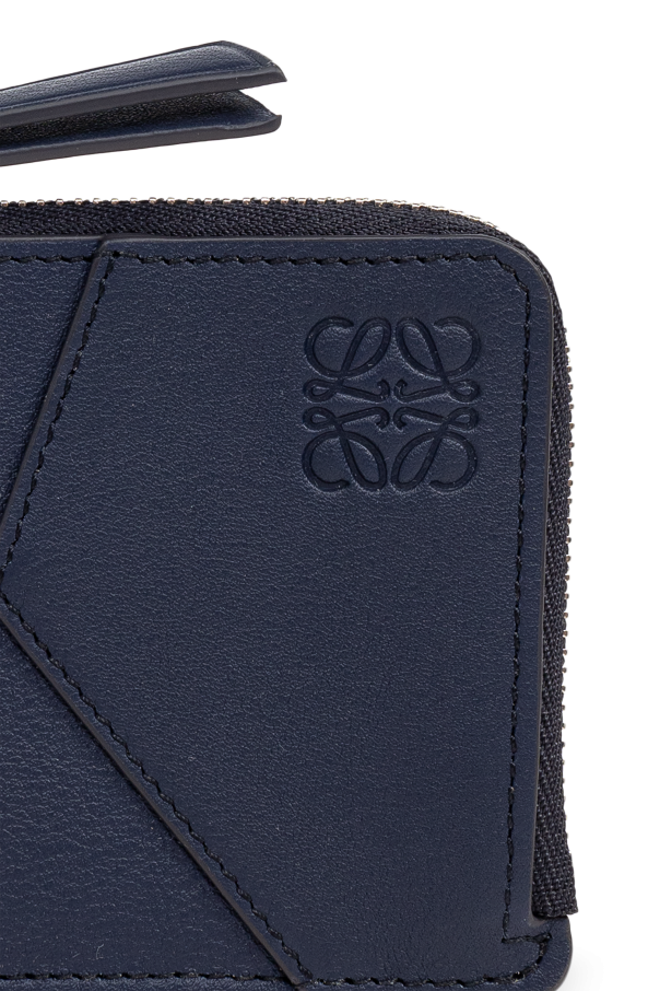 Introducing the \'Puzzle\' card holder by Loewe, a masterpiece of design that melds functionality with high fashion. Crafted from 100% calfskin leather, this exquisite accessory is a testament to durability and luxurious sensibility. Its navy hue is both deep and distinguished, lending an air of sophisticated charm. The front of the \'Puzzle\' card holder is adorned with a distinctive geometric pattern of lines that interlock in a manner reminiscent of a puzzle. This unique design is further accentuated by the embossed logo of the designer, Loewe, in the top right corner—a symbol of quality and artistic craftsmanship. The back is elegantly smooth, save for several vertical stitches that serve as pockets for card storage, blending functionality with sleek design. The interior reveals a spacious compartment ideal for securing additional items, while a small, metal embellishment on a leather loop hints at its versatility, serving either as a keyring or a chic aid for opening. This feature, along with the card holder’s overall design, marries practicality with the allure of high fashion. Why purchase this product? Elegance and Durability: Made from 100% calfskin leather, ensuring both a sophisticated look and long-lasting use. Unique Design: The geometric \'Puzzle\' pattern and embossed Loewe logo stand as a testament to innovative design and luxury. Functionality: Equipped with a zippered pocket, a slip pocket, and six card slots, offering ample storage in a sleek package. Versatile Accessory: A metal pendant on a leather loop adds functionality, doubling as a keyring or an elegant opener.