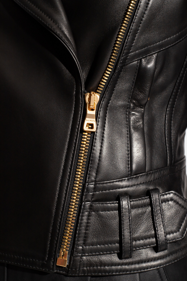 Black fitted jacket from Balmain. Crafted from lamb leather, this garment is complete with two metal zips, three front zip pockets, rounded notch lapels, epaulette details with decorative snaps with the brand’s signature lion head, sleeve pocket with a flap, gold-tone metal hardware and cuffs with zips and decorative straps.