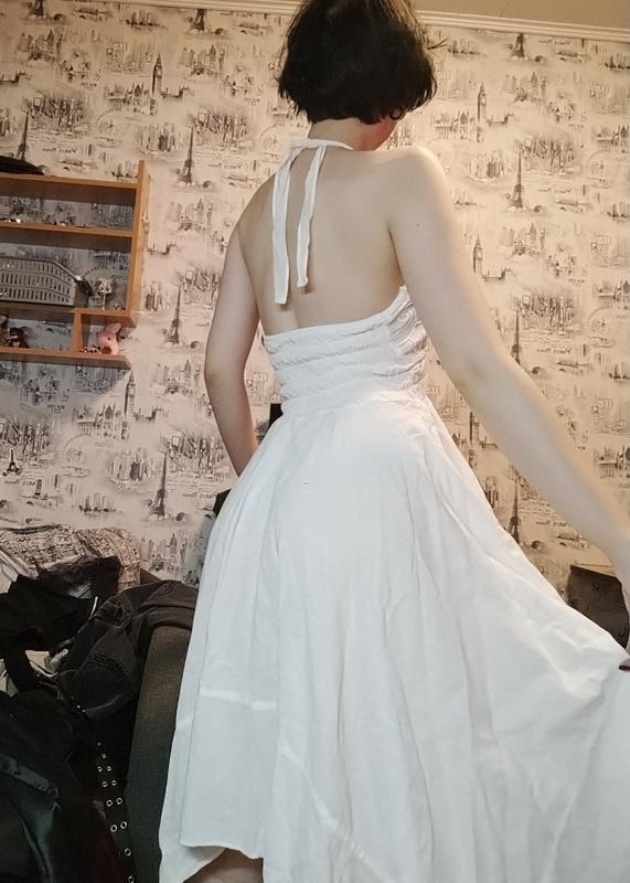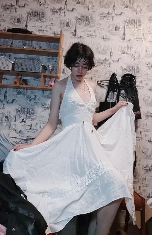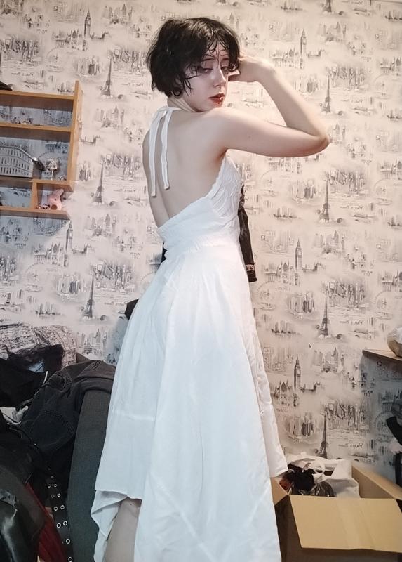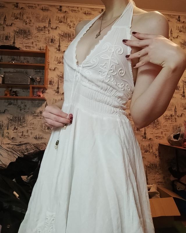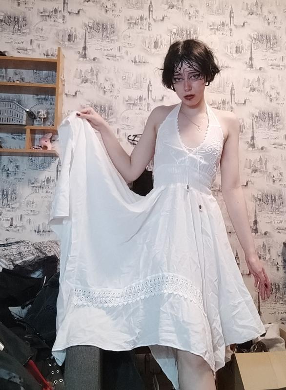 Имеет интересный крой низа юбки, узоры, и вырез на груди, который красиво стягивает грудь, завязка на шее. Красиво тянется. На талии корсет из резинки который подчеркивает талию.
