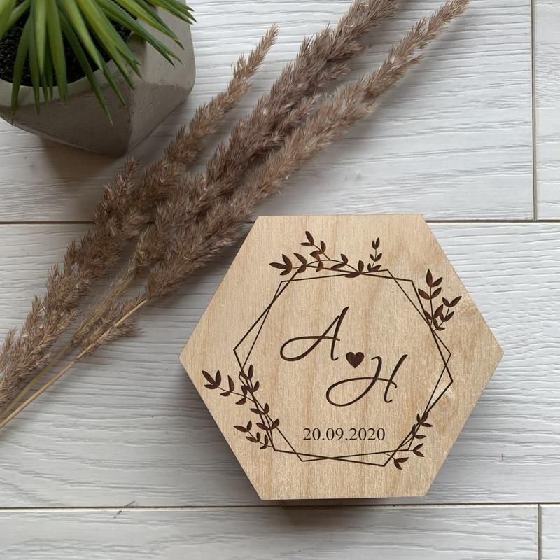 Ярким и необыкновенным дополнением свадебной церемонии станет деревянная коробочка для колец с стабилизированным декоративным мхом. Уникальности такой свадебной коробочке добавляет персонализация на крышке: имена молодоженов, дата свадьбы, любая надпись или символ.