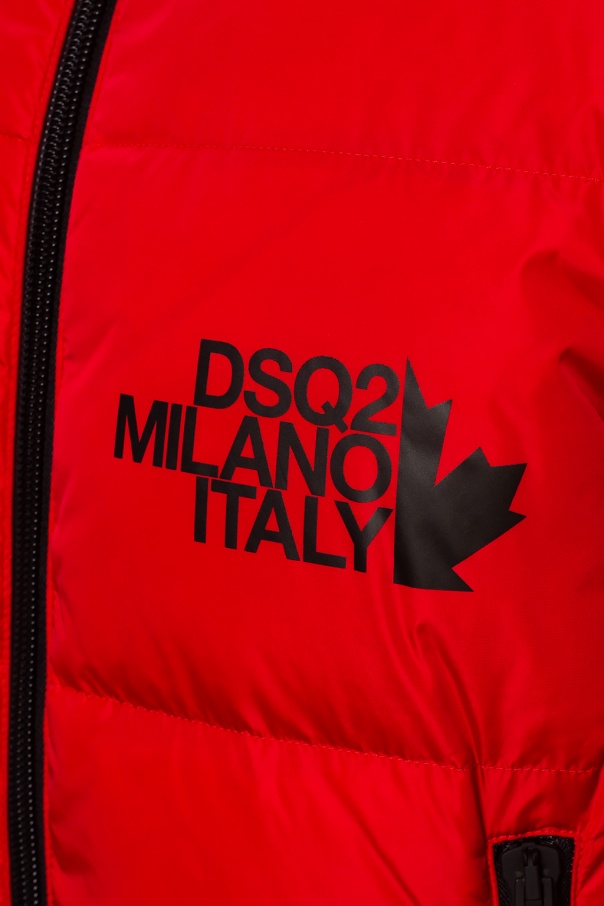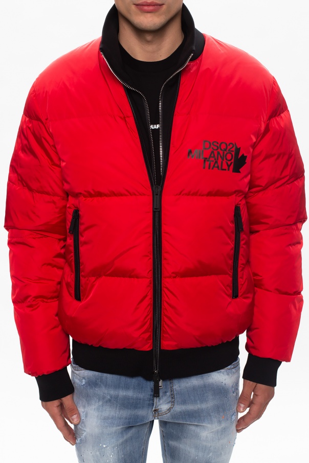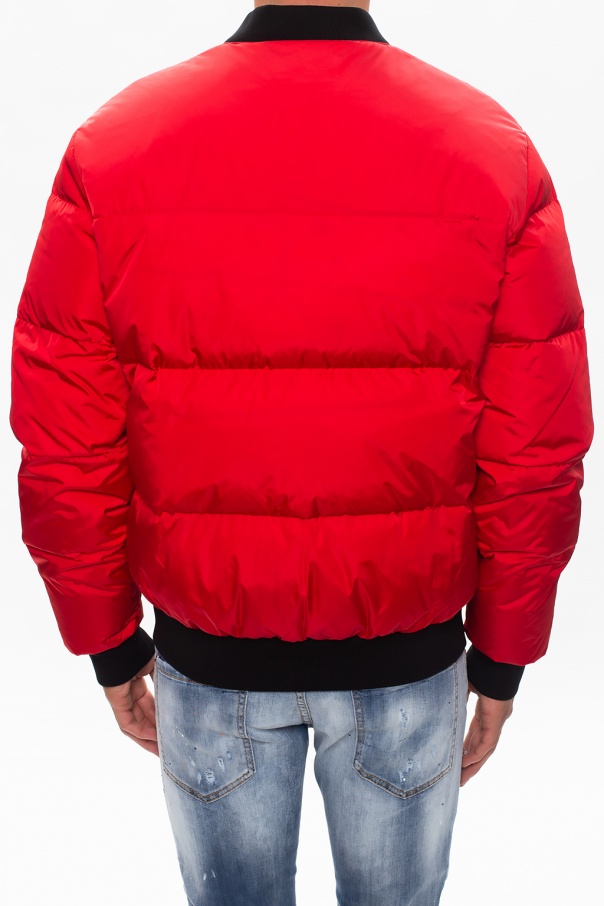 Red and black quilted bomber jacket from Dsquared2. Padded with down, this item features a two-way zip fastening, a black logo print, two zip pockets on the front, long sleeves and ribbed trims at the hem and cuffs.
