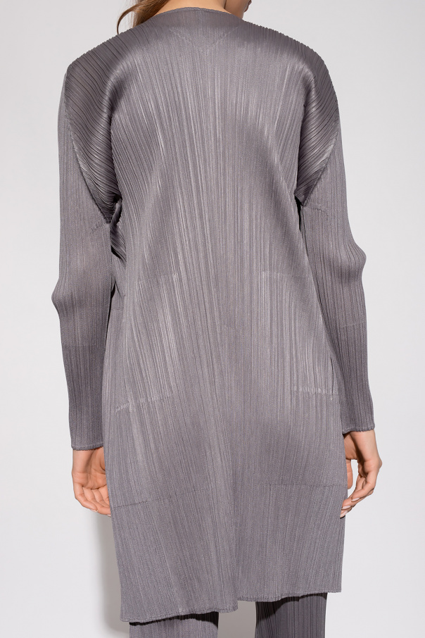 Dark grey cardigan from Issey Miyake Pleats Please. Distinguished by the brand's signature pleating technique, this style features long sleeves.
