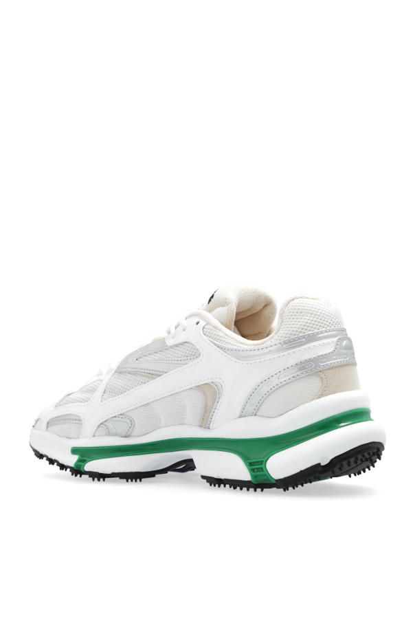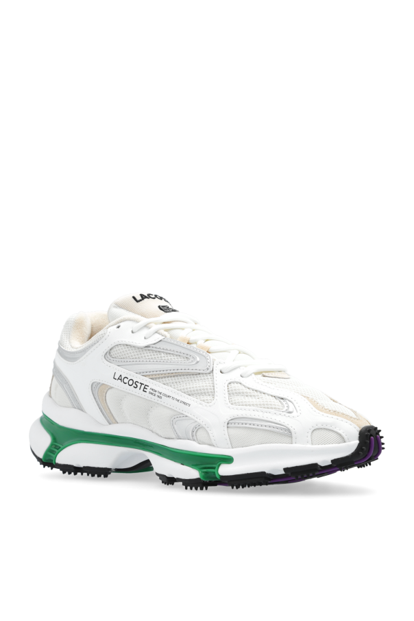 White, cream and beige ‘L003’ sneakers from Lacoste. Made from mesh and faux leather, this lace-up model sits on a multicoloured rubber sole and showcases an embroidered black logo on the tongue, white and silver-tone decorative panels and a breathable Ortholite® insole.
