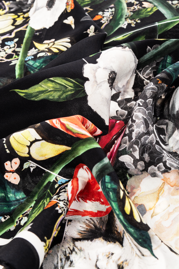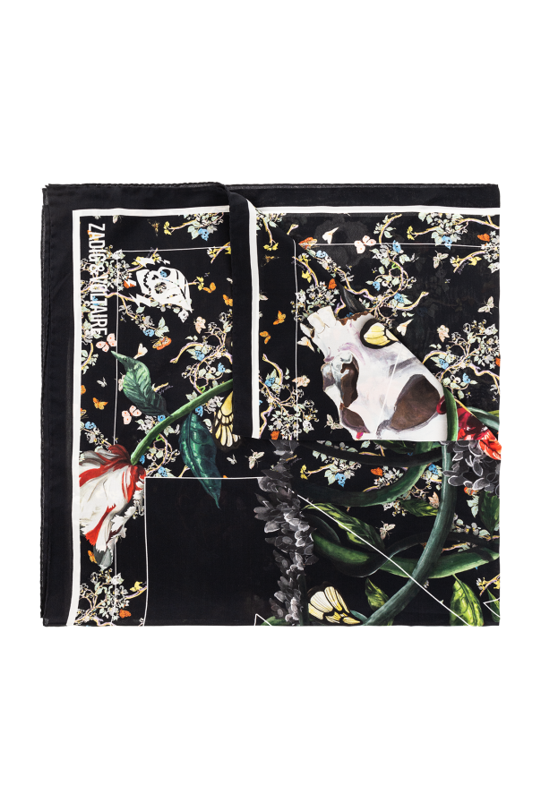 Black shawl from Zadig & Voltaire. Made of silk, this item showcases a colourful pattern with a skull, flowers and logo.