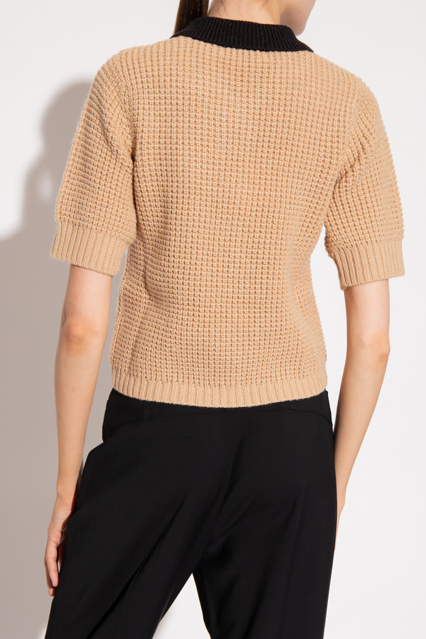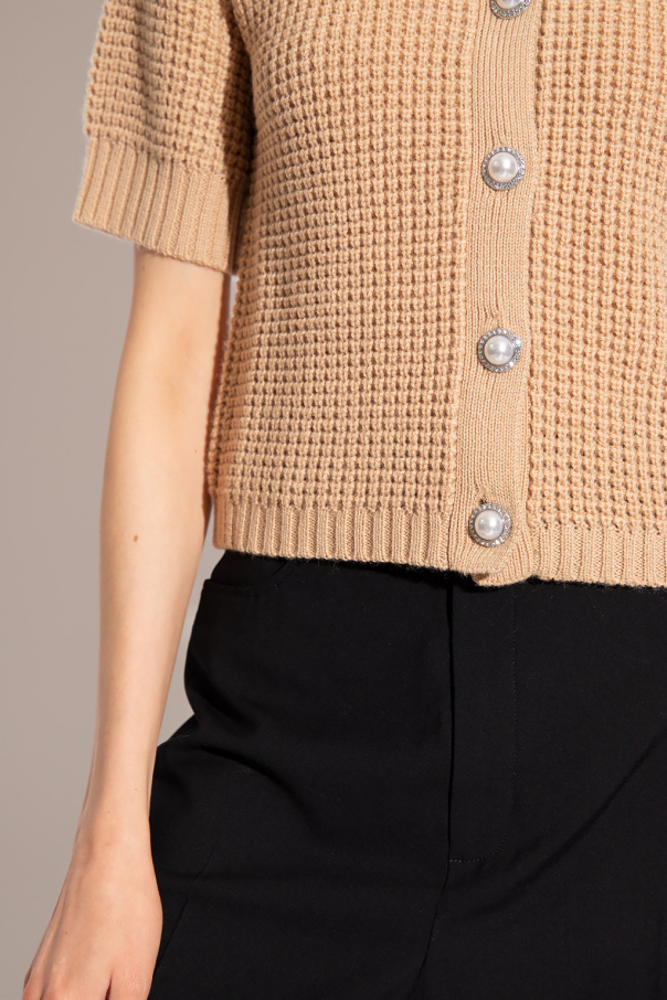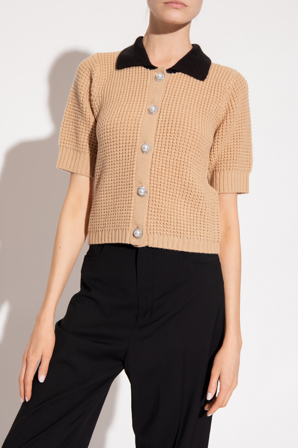 Beige and black ‘Verda’ cardigan with a classic collar from Custommade. Crafted in a ribbed knit design, this style features short sleeves and glistening buttons with a pearl trim.