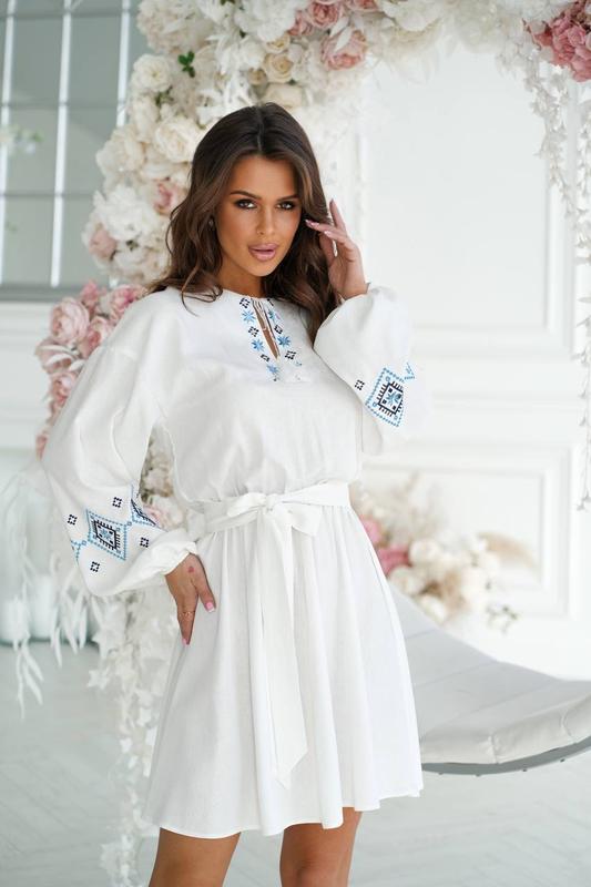 Льняна сукня з вишивкою та розкльошеною спідницею.